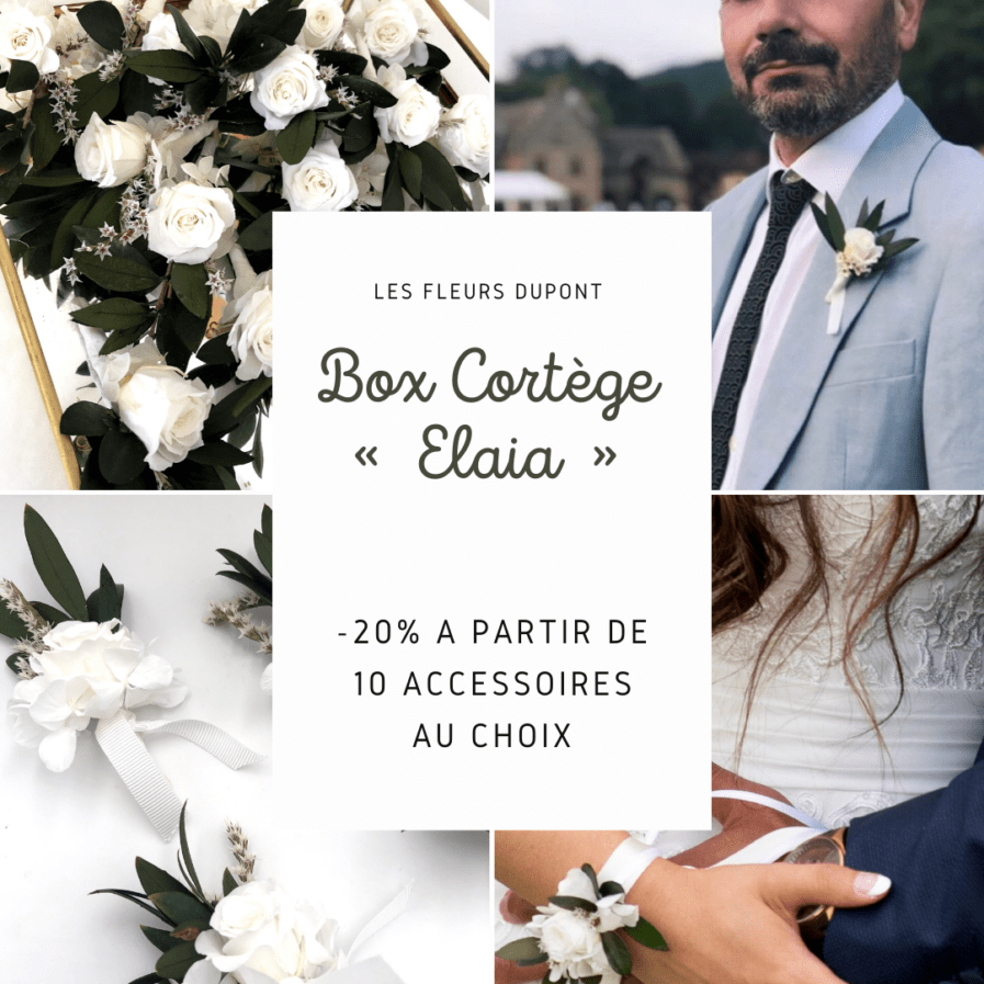 La Box Cortège Elaia est proposée par Les Fleurs Dupont à partir de la saison 2019, pour faciliter le choix des accessoires du cortège de mariage. Déclinée sur les tons blanc et végétal de la gamme Elaia, la box permet de choisir entre les bracelets de demoiselles d’honneur et les boutonnières Elaia pour les témoins ou le marié.
