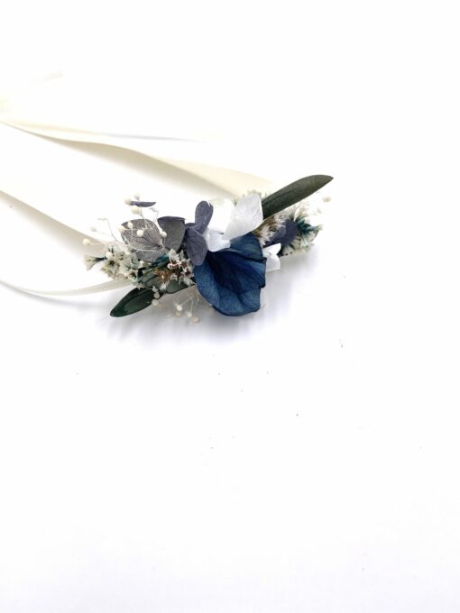 Le bracelet en fleurs stabilisées Acqua est une création aux accents bohème, mais à l’esprit moderne, offrant un bijou de fleurs durables à la mariée d’aujourd’hui. Il pourra s’associer avec goût aux autres accessoires de la même gamme pour la mariée, comme la couronne.