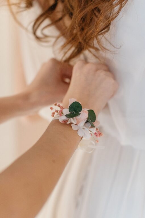 Le bracelet de demoiselles d’honneur Confetti fait partie de la gamme Confetti, qui se distingue par ses tons doux et sucrés rose pastel et dragée. Romantique et élégant, le bracelet de mariage Confetti est un mélange délicat de plusieurs fleurs stabilisées, et se conservera durant plusieurs années. Il associe ainsi des hortensias stabilisées roses, des brins de gypsophile stabilisé rose poudré, de petites feuilles d’eucalyptus au côté vert acidulé, et de délicats boutons de roses stabilisées. La gamme Confetti, de la collection Romantique, offre une touche très sucrée, pastel et romantique à votre tenue.