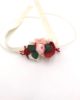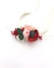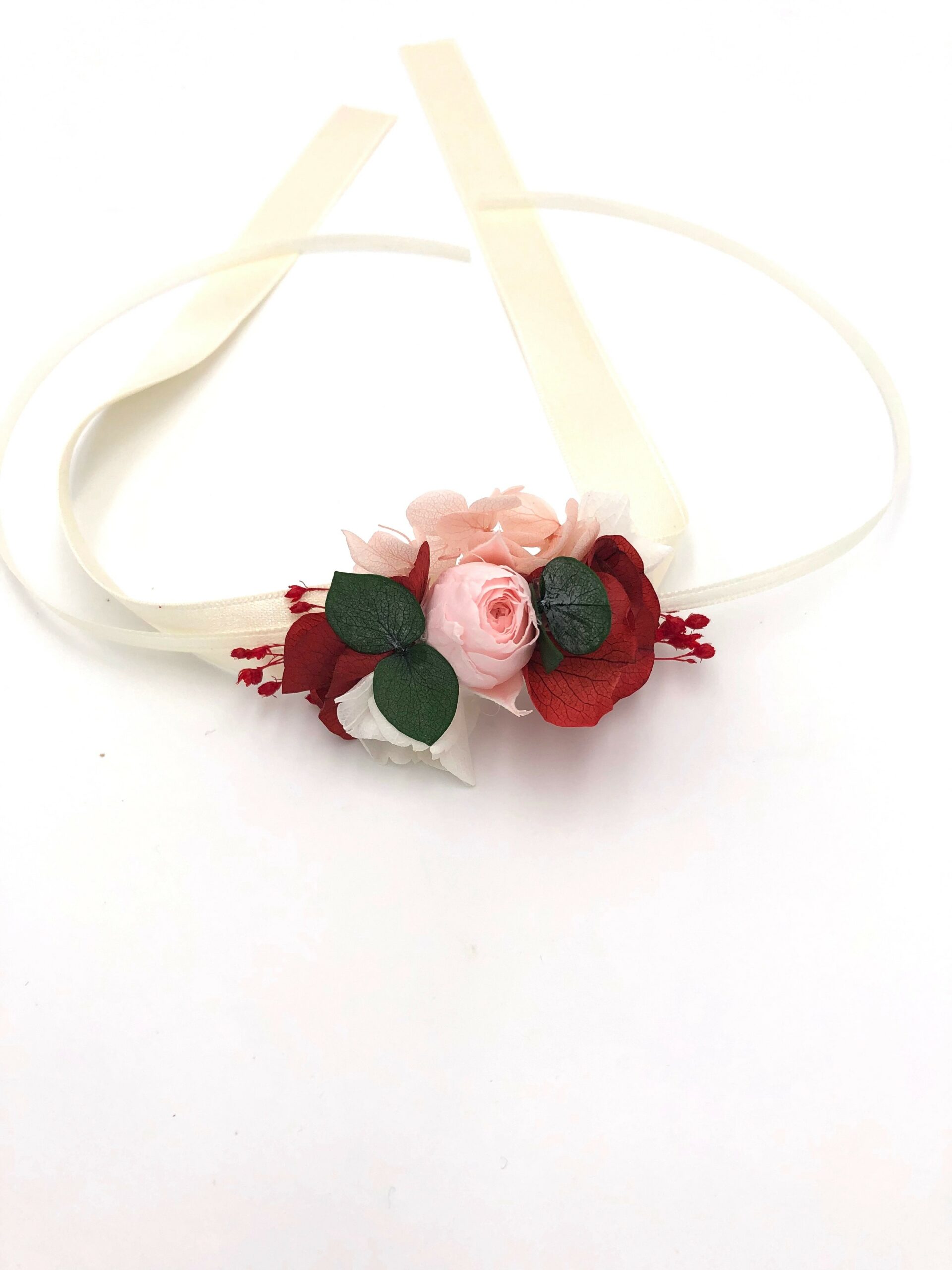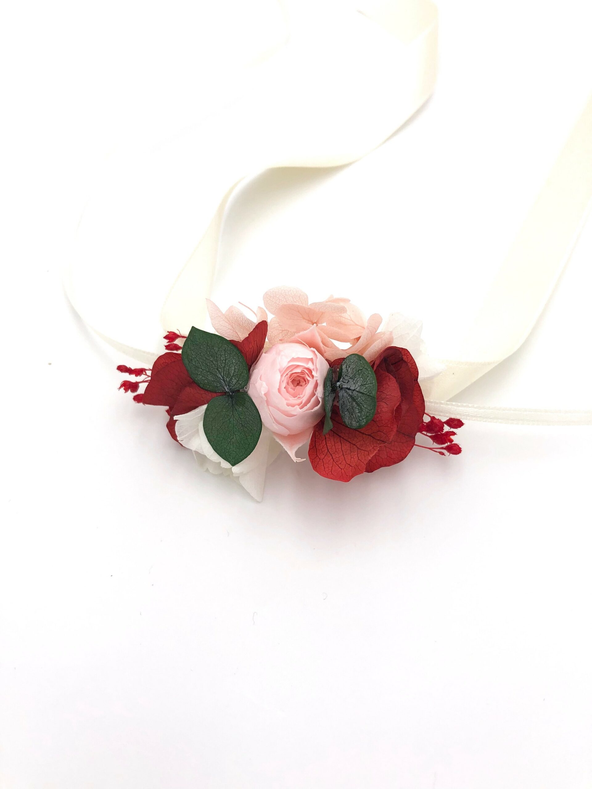 Le bracelet de fleurs stabilisées Arabesque se compose ainsi de plusieurs fleurs stabilisées : des hortensias stabilisées bordeaux/rouge, rose pâle et blanc, ainsi que des feuilles d’eucalyptus baby blue, un bouton de rose stabilisée rose pâle et des touches de broom stabilisé rouge. C’est un accessoire très frais et estival, aux allures festives et distinguées, qui magnifiera votre cortège de mariage par son éclat et son caractère.
