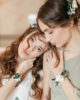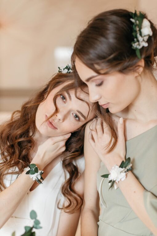 Le bracelet de demoiselles d’honneur Elaia peut se combiner avec différents accessoires de cheveux pour la mariée, comme la couronne ou le peigne Elaia. Il est également très chic d’associer la mariée avec le marié ou encore les témoins et membres de la famille, grâce à la boutonnière de la même collection.
