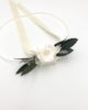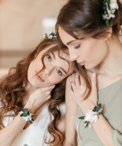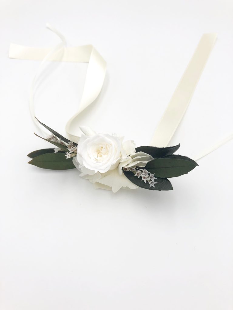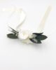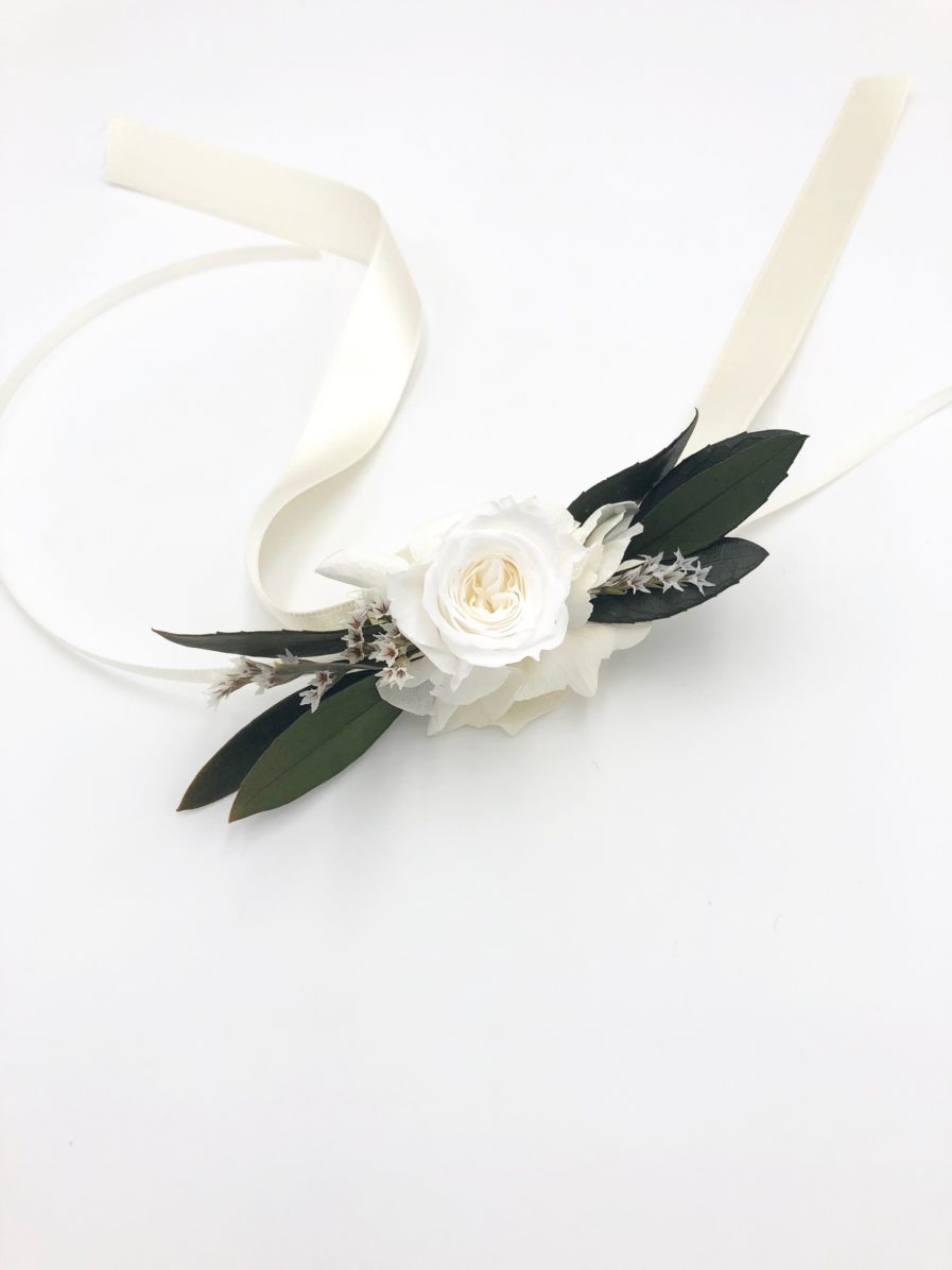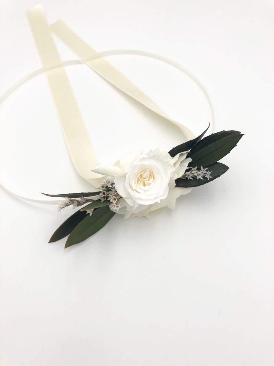 Le bracelet de demoiselles d’honneur Elaia fait partie de la gamme Végétale, qui se distingue par ses tons verts et blancs. Chic et champêtre, c’est un mélange délicat de plusieurs fleurs stabilisées et séchées, et se conservera durant plusieurs années. Il associe ainsi des feuilles d’olivier stabilisées, des petites brins de mini gypsophile, des brins de statice étoilé séché, et un bouton de rose blanche stabilisée. La gamme Elaia, de la collection Végétale, offre une touche nature et fraîche, chic et raffinée avec ses boutons de rose immaculés.
