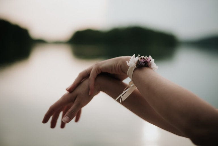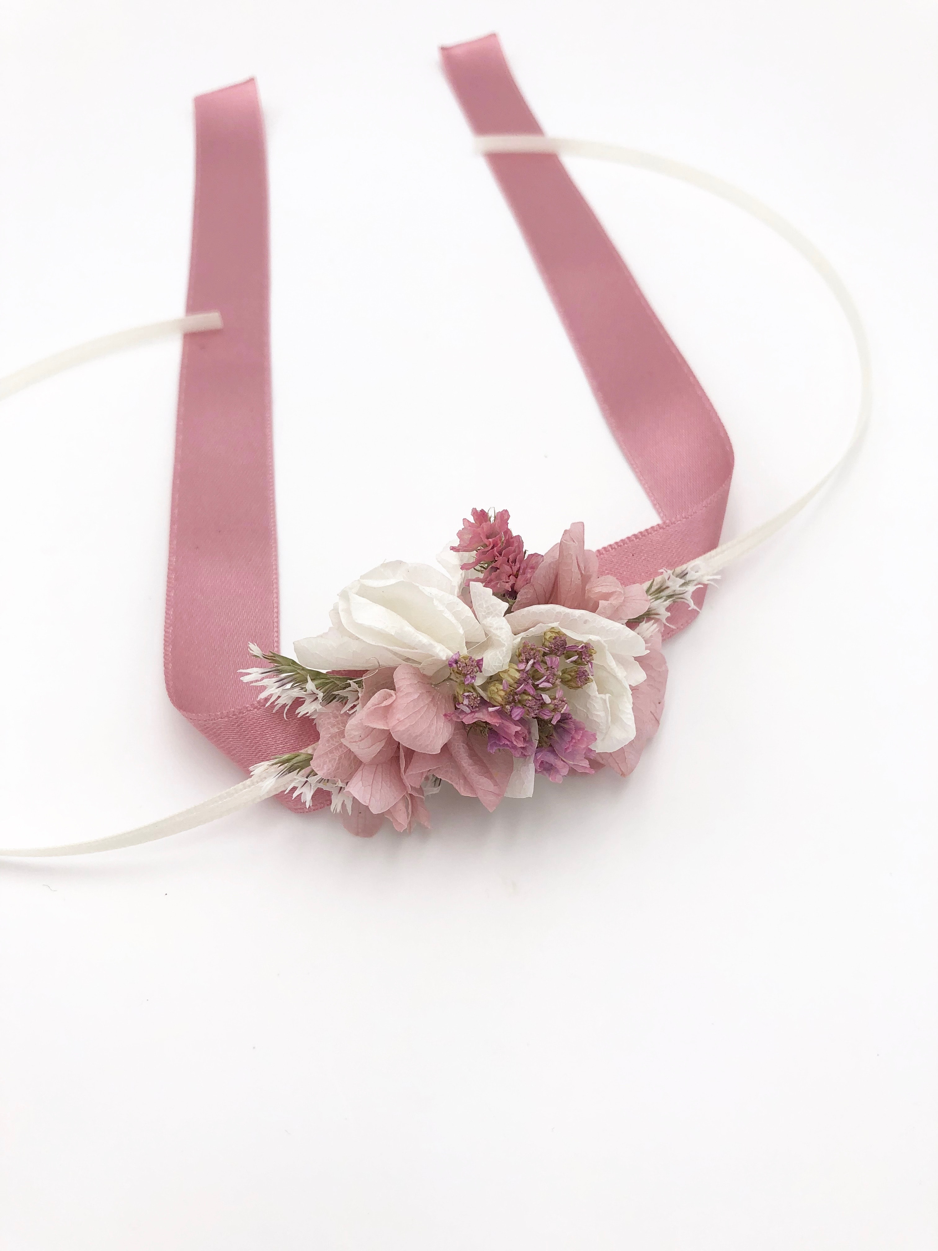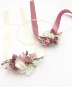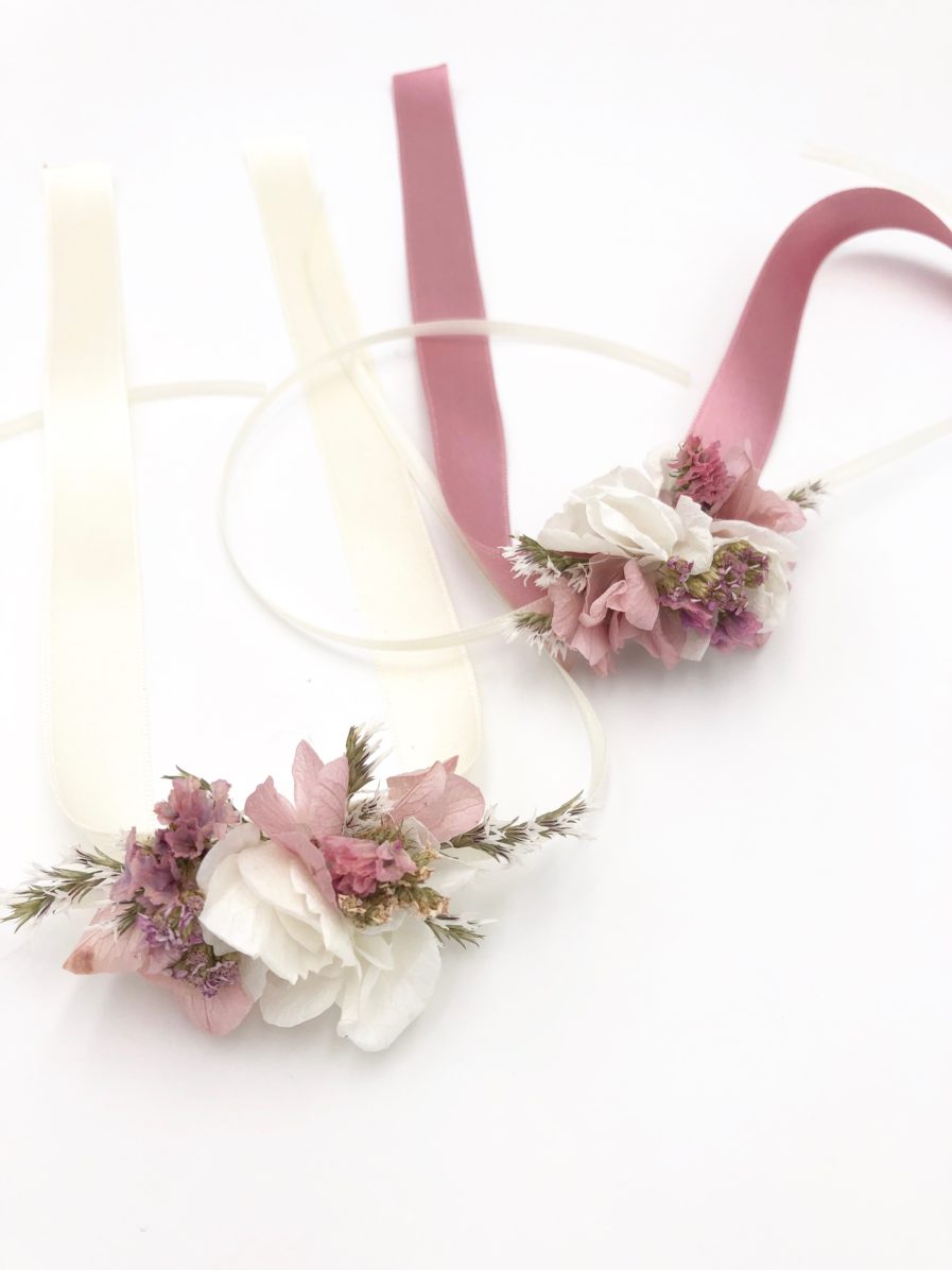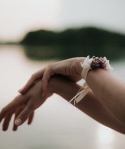 Le bracelet de demoiselles d’honneur Lilla est un rappel très chic à arborer pour être assortie avec goût à la mariée. Avec ses tons rose poudré et blanc, le bracelet de fleurs s’associe parfaitement avec les autres accessoires de la collection Lilla, comme la couronne de fleurs.