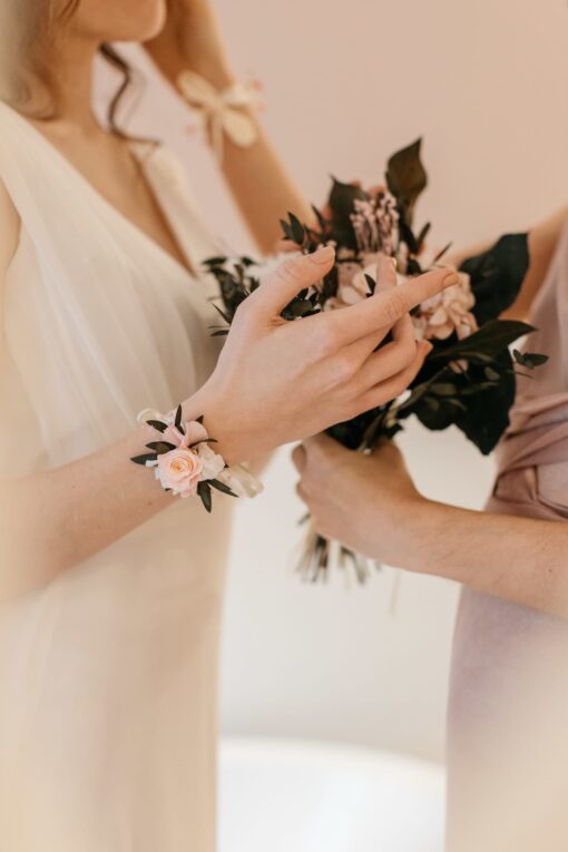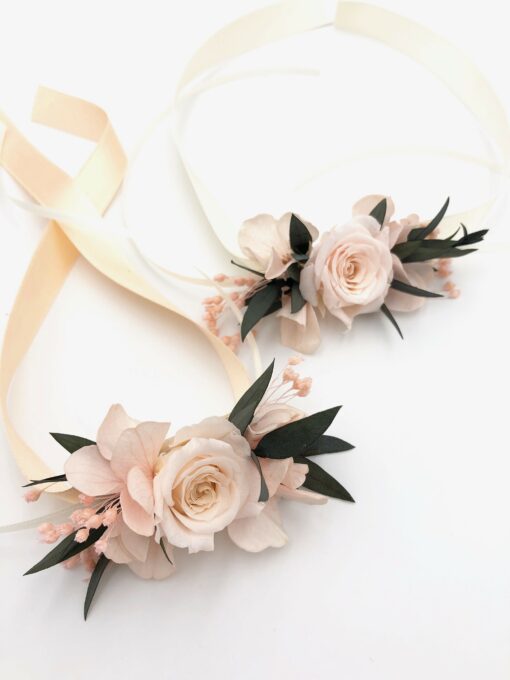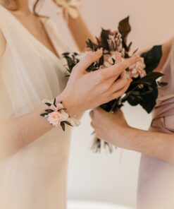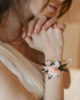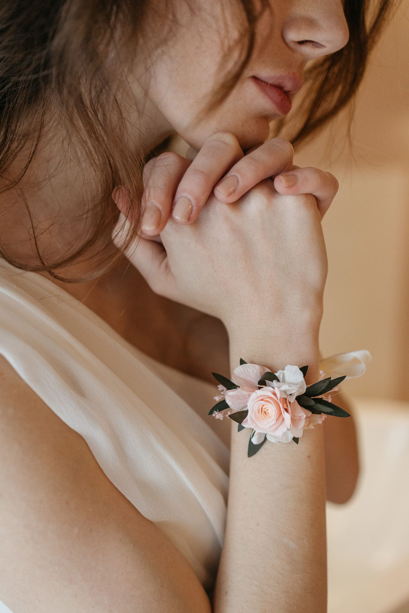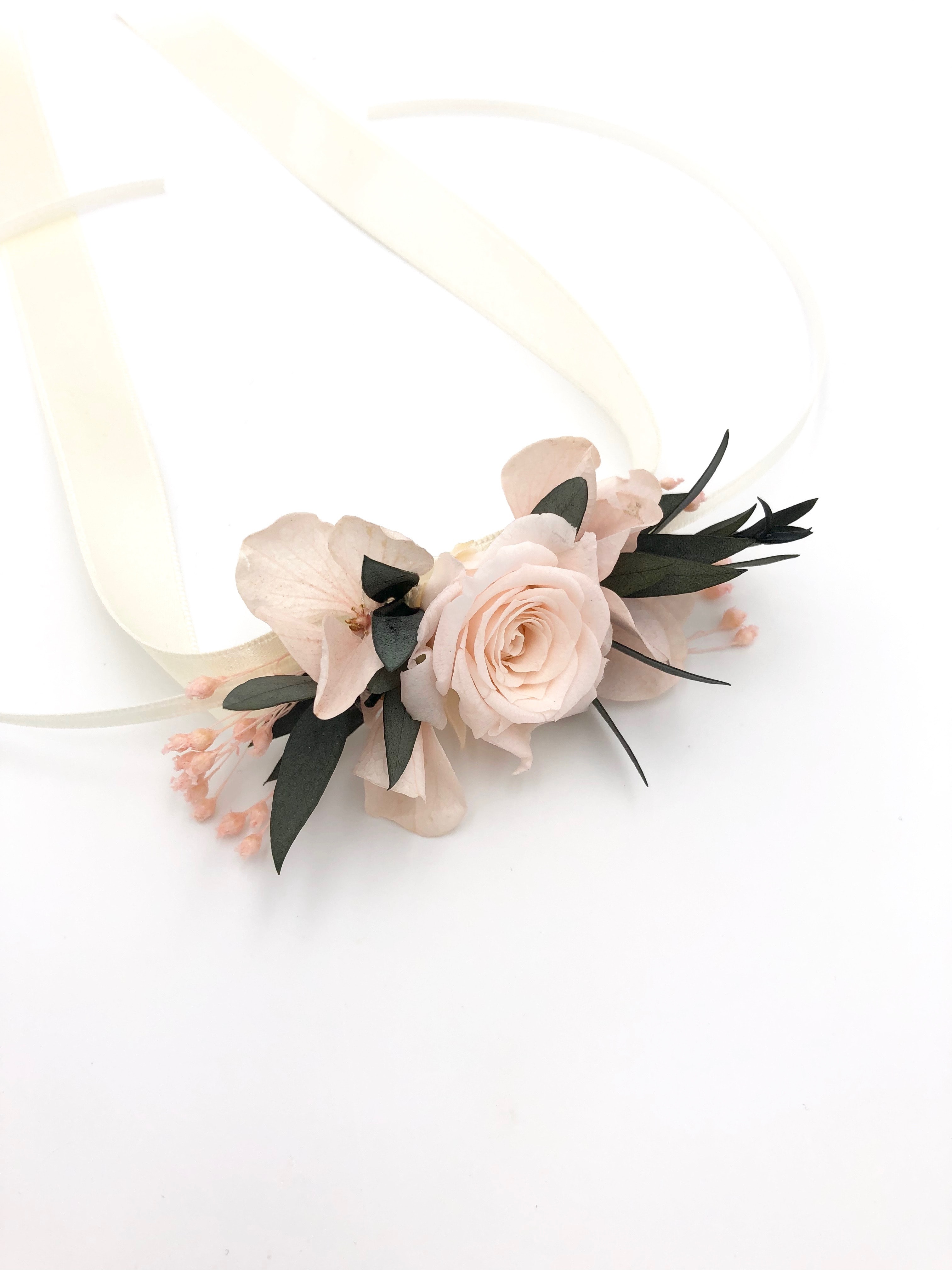 Ce bracelet se conserve plusieurs années grâce à ses fleurs séchées et stabilisées, et pourra ainsi être commandé à l’avance et gardé en souvenir ensuite.