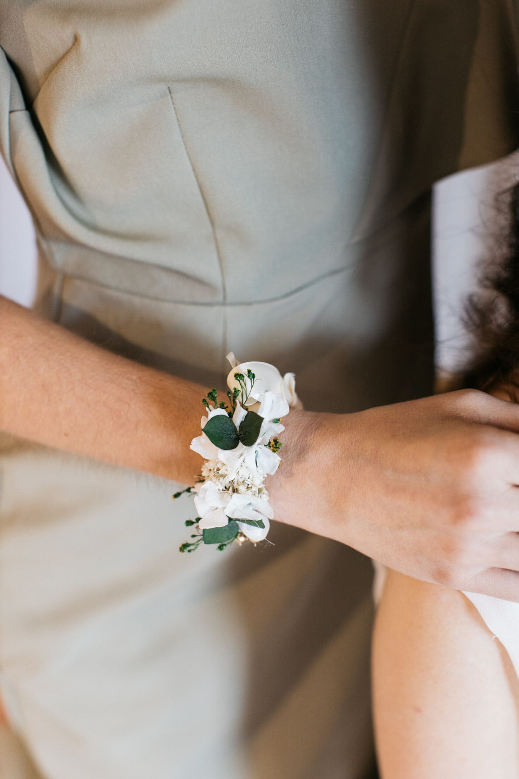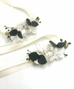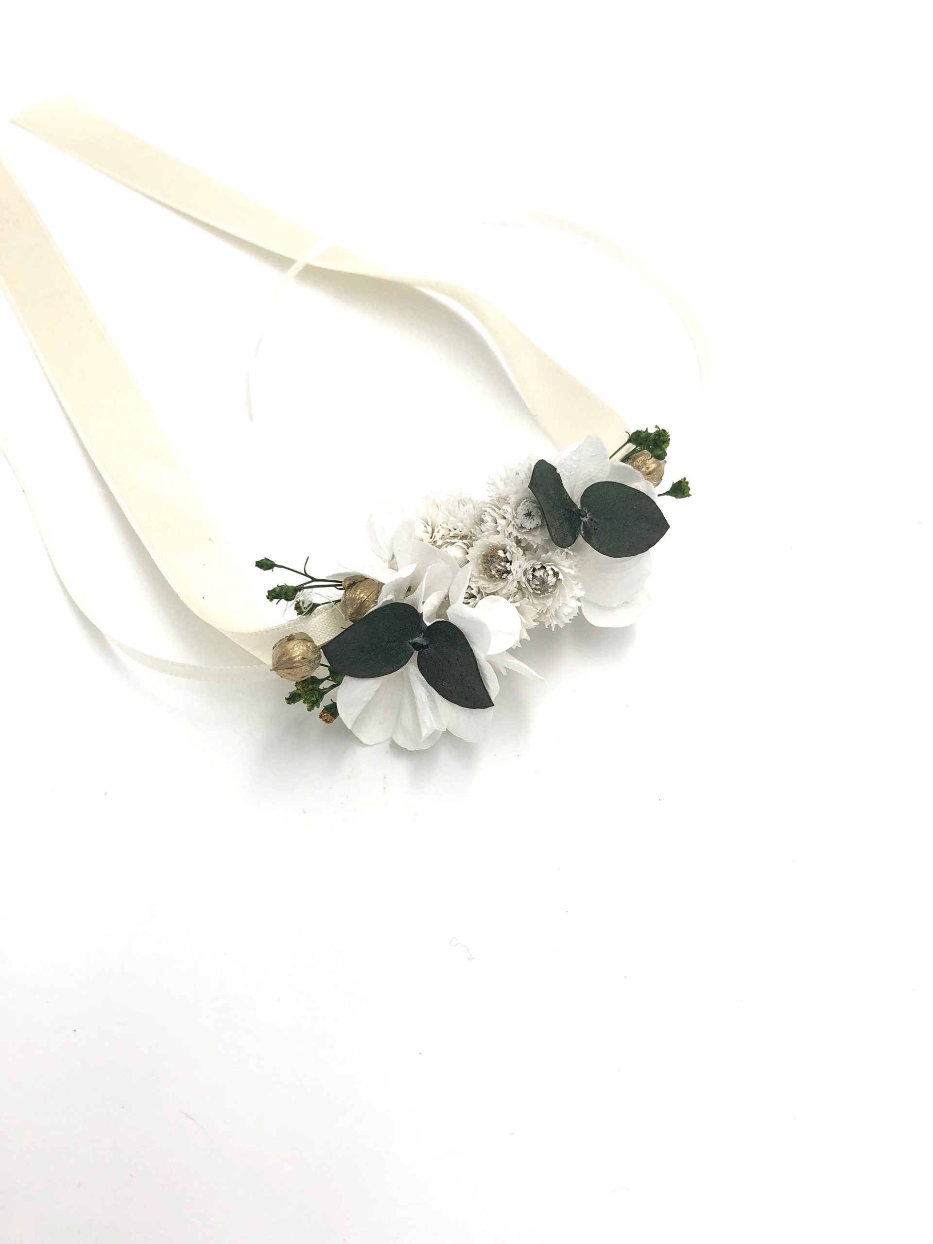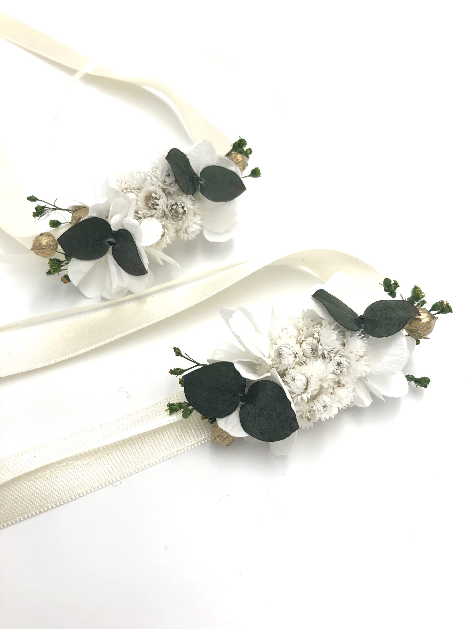 Le bracelet de demoiselles d’honneur Minthé fait partie de la gamme Végétale, qui se distingue par ses tons verts, blancs et dorés. Chic et champêtre, c’est un mélange délicat de plusieurs fleurs stabilisées et séchées, et il se conservera durant plusieurs années.