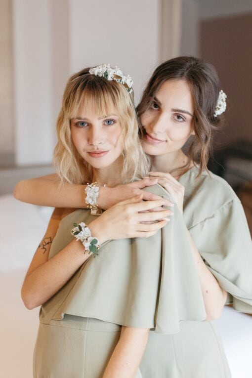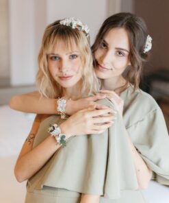 Le bracelet de demoiselles d’honneur Minthé peut se combiner avec différents accessoires de cheveux pour la mariée, comme la couronne ou le peigne Minthé.