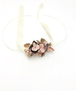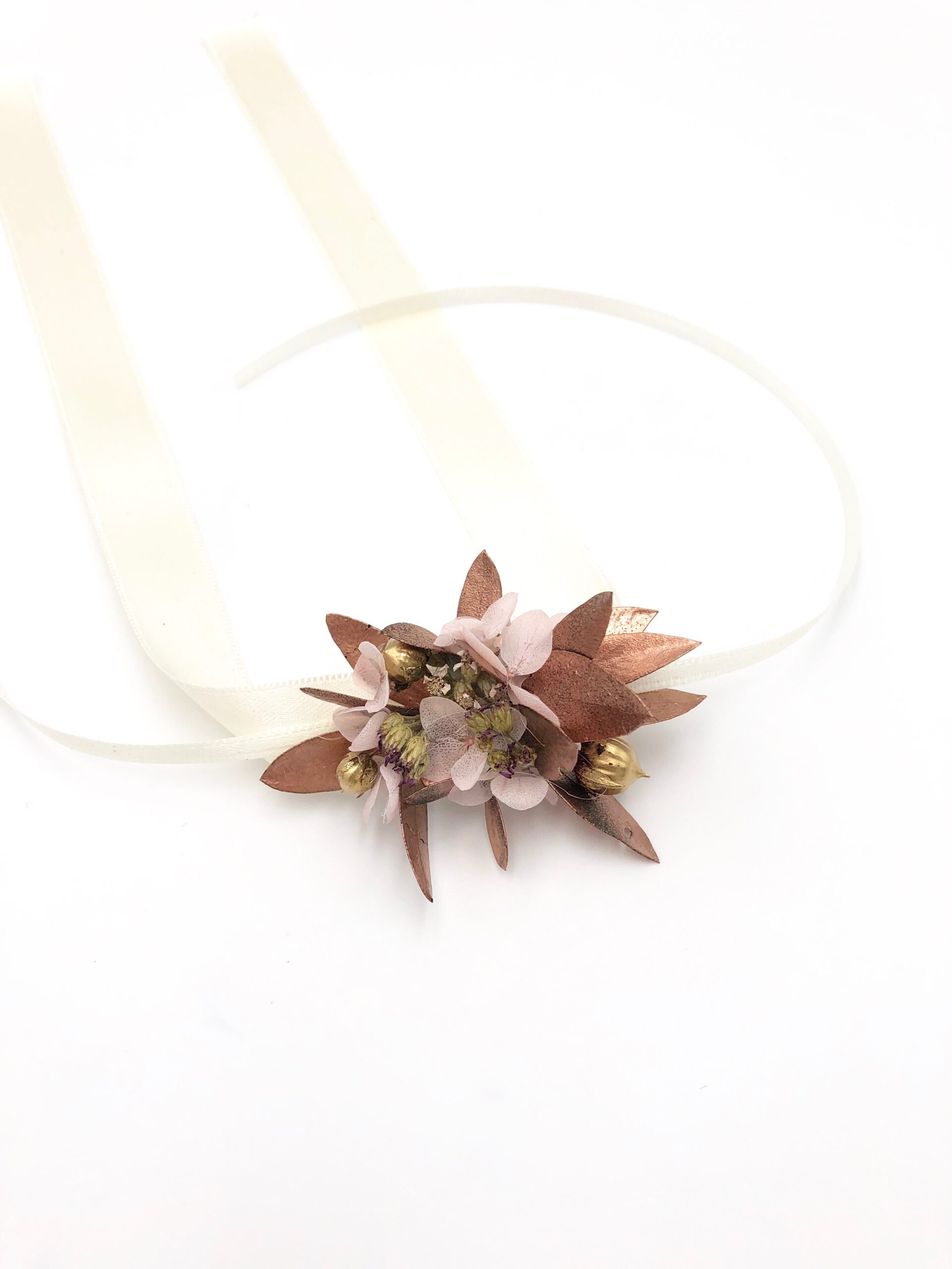 Il peut être particulièrement chic que les demoiselles d’honneur portent ce bracelet de fleurs et que les témoins et le marié arborent une boutonnière aux tons similaires, dans un mariage au thème romantique. Avec ses doux tons rose et cuivrés, c’est un accessoire très élégant et intemporel, qui sublimera discrètement la tenue de la mariée, ou de ses demoiselles d”honneur.