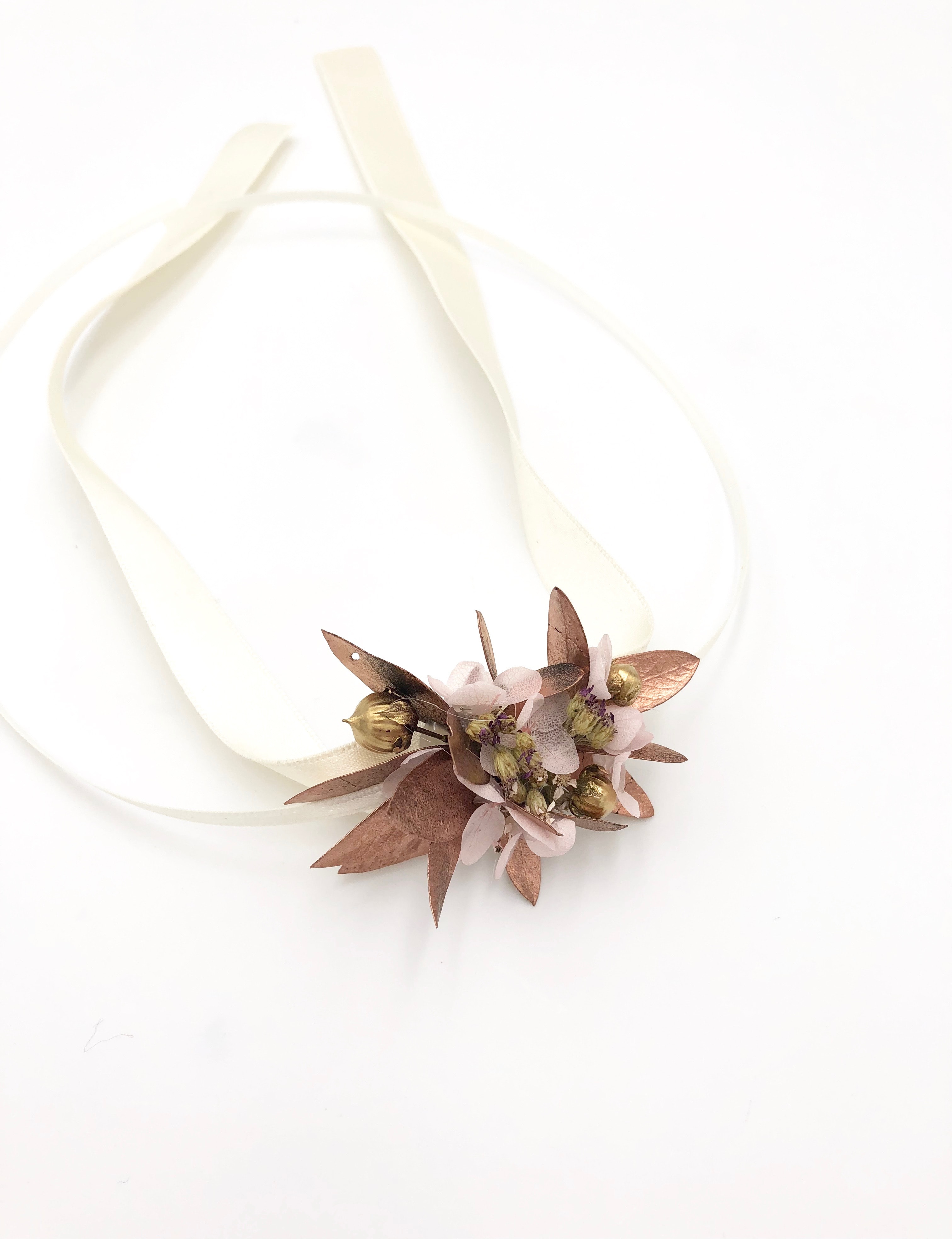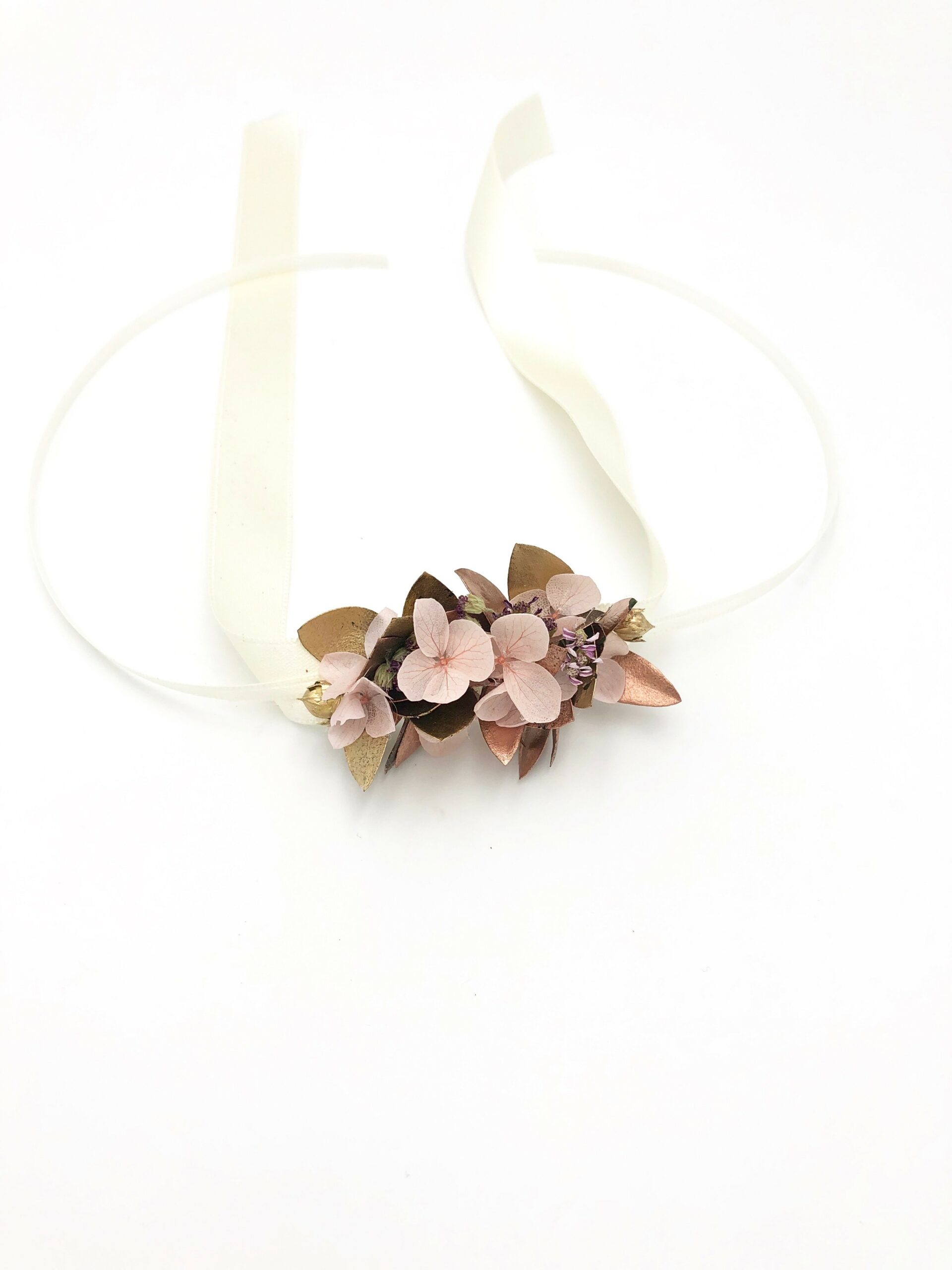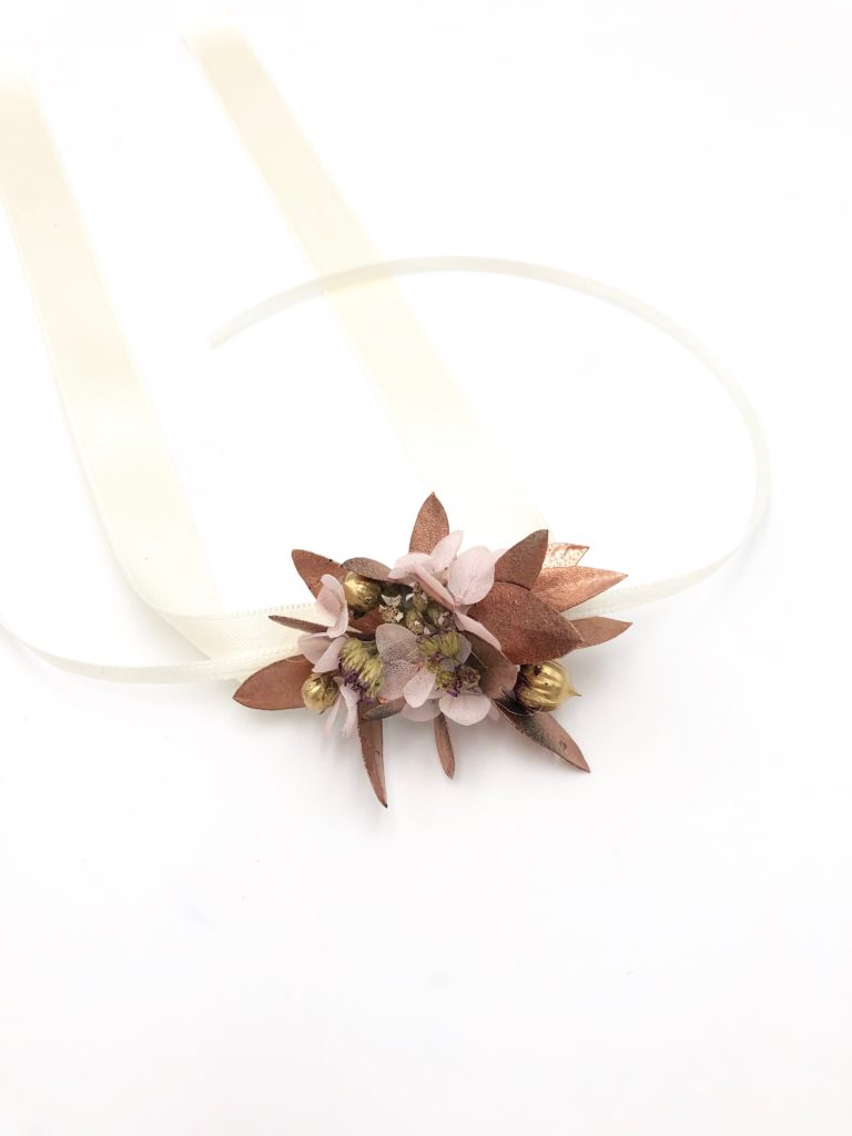 Cet accessoire en fleurs naturelles fait partie de la nouvelle collection pour 2019, aux inspirations antiques et dorées. Le bracelet de demoiselles d’honneur Phyra est composé de fleurs séchées (billes de lin dorées, achillée rose) et de fleurs stabilisées (feuilles d’eucalyptus cuivrées et hortensia rose).. C’est un complément parfait à la couronne de fleurs Phyra par exemple, ou au peigne de mariée Phyra, de la collection Orichalque.
