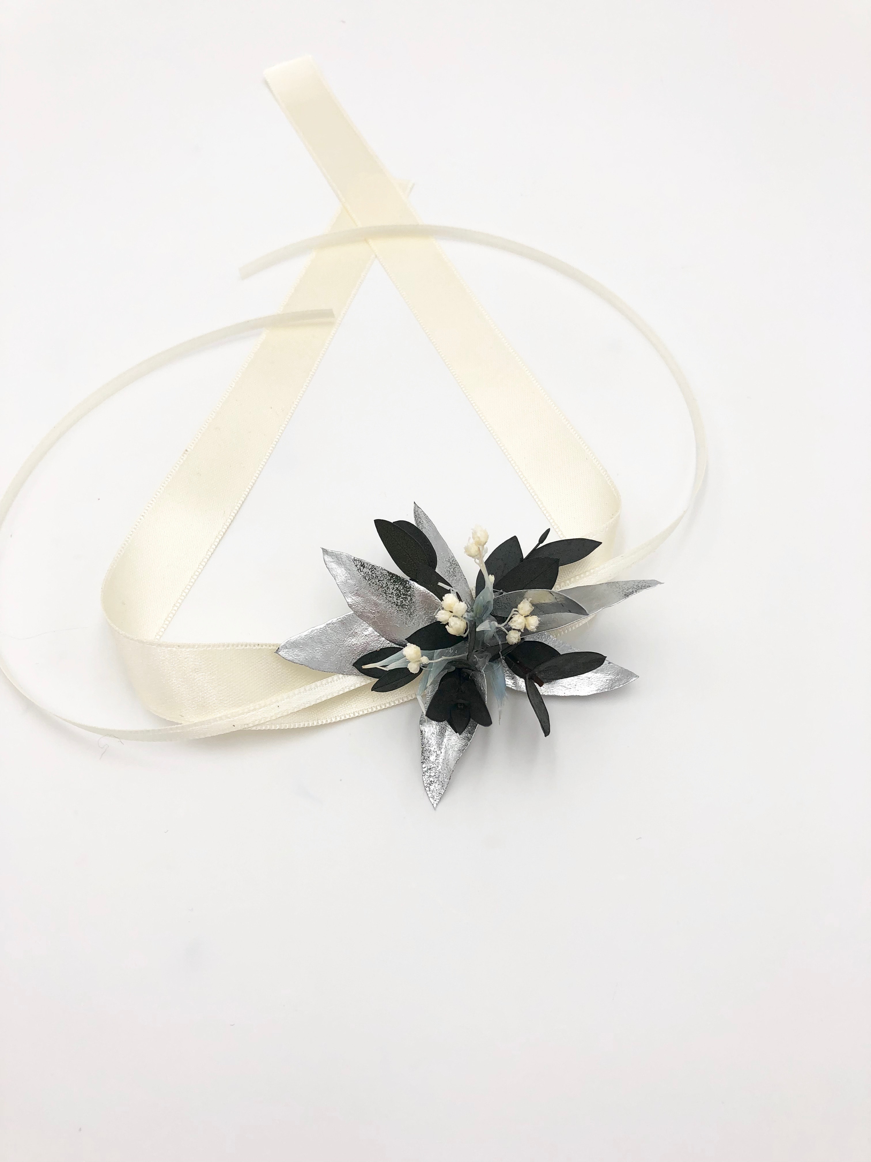 Cet accessoire en fleurs naturelles fait partie de la collection Orichalque, aux inspirations antiques. Le bracelet de demoiselles d’honneur Turquin se compose de fleurs séchées (brins d’avoine bleuté) et de fleurs stabilisées (feuilles d’eucalyptus au naturel et argenté). C’est un complément parfait à la couronne de fleurs Turquin par exemple, ou au peigne de mariée Turquin, de la collection Orichalque.