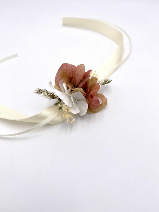 - Fleurs stabilisées naturelles (hortensia mini blanc, hortensia mini pêche, hortensia crème/blush, mini gypso ivoire)