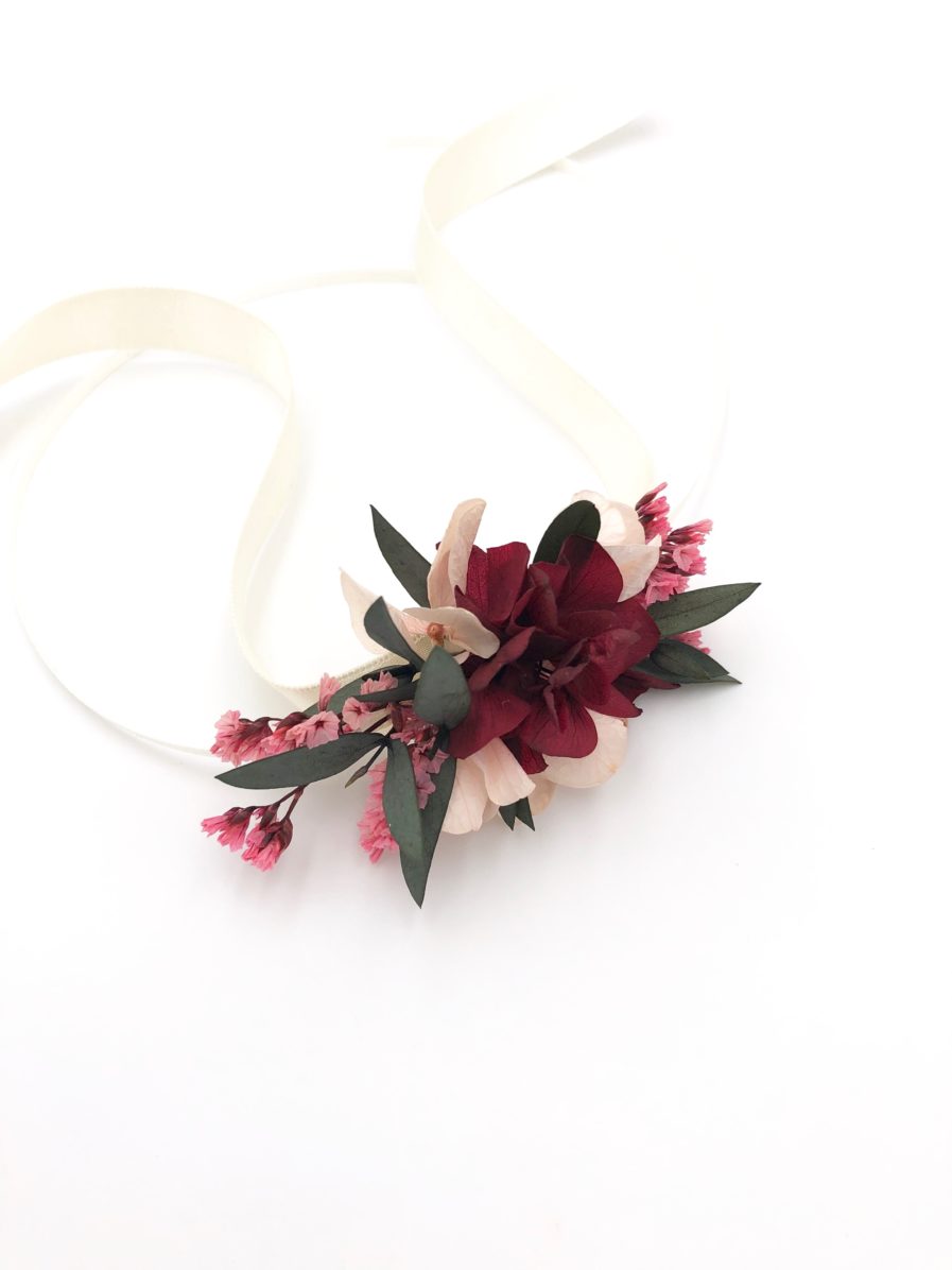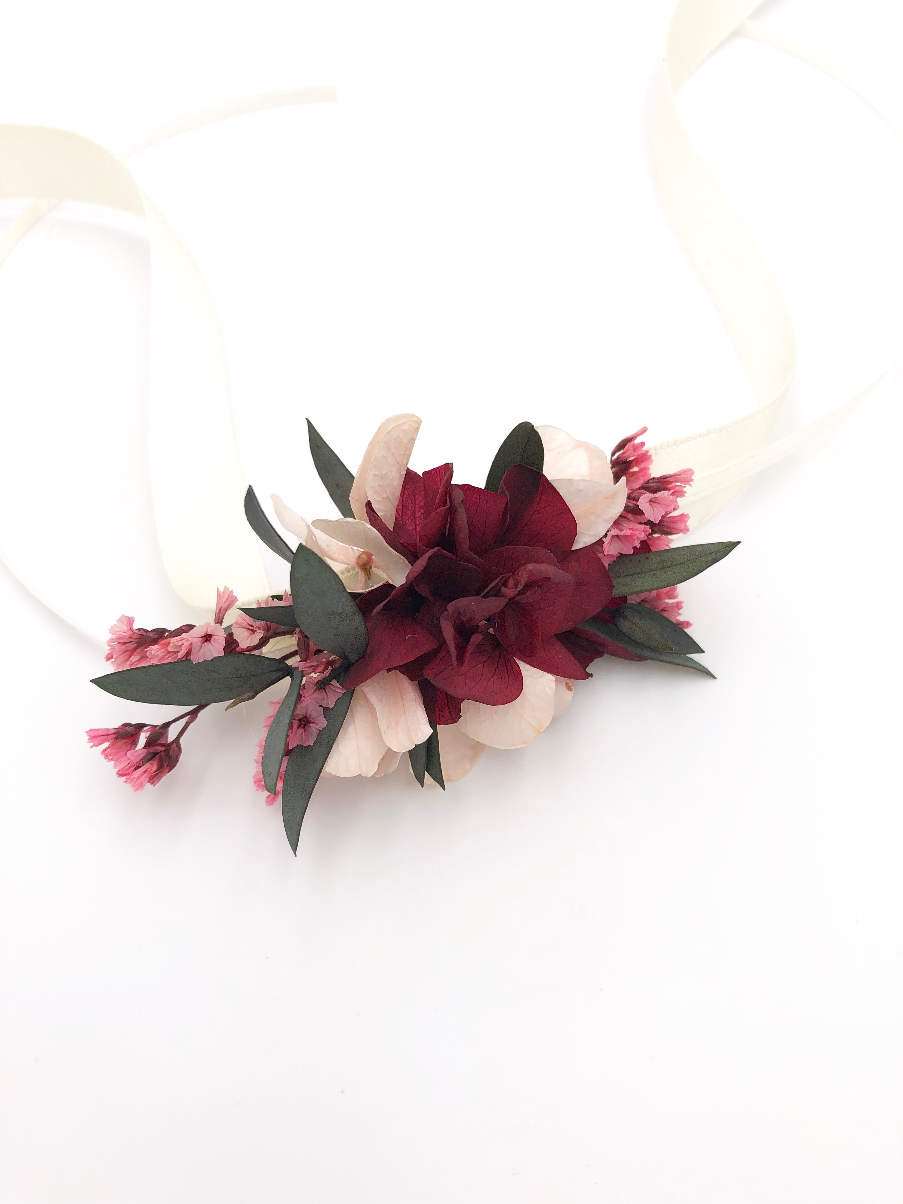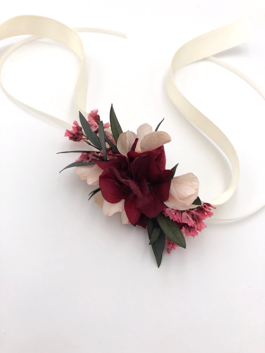 Le bracelet en fleurs stabilisées Carmin a été conçu comme un accessoire résolument contemporain, avec un travail précis sur les textures et les couleurs, pour offrir un bijou de fleurs sophistiqué et élégant. La belle robe de ces hortensias bordeaux sera idéale pour sublimer votre décoration et vos tenues de mariage, sur un thème très élégant de déclinaisons de rouge et de bordeaux.