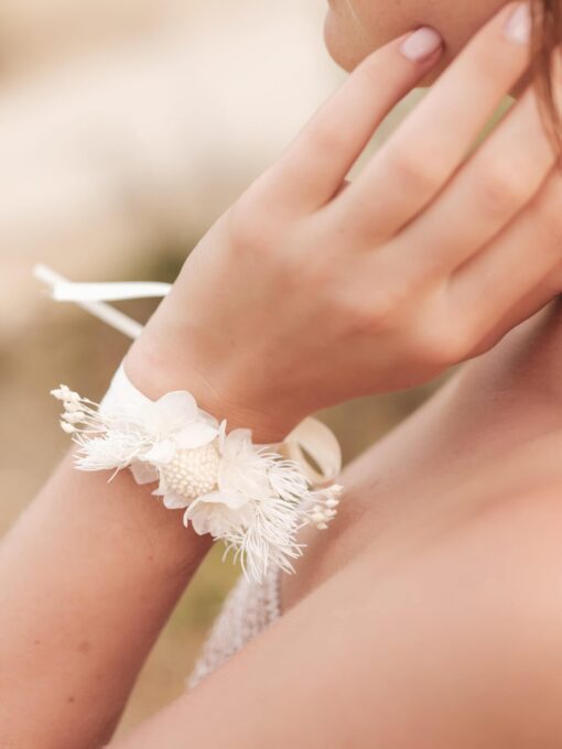 Le bracelet en fleurs stabilisées Nimbe est un accessoire pour demoiselles d’honneur, amies, mères ou soeurs de la mariée, qui est idéal comme cadeau et comme signe distinctif durant la journée de mariage ! C’est la petite touche fleurie parfaite pour assortir la mariée à ses demoiselles d’honneur et ses proches.
