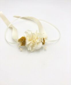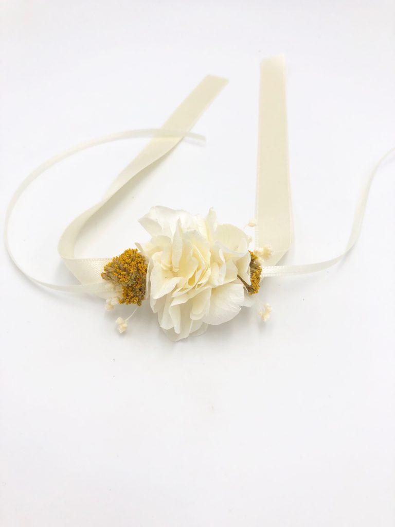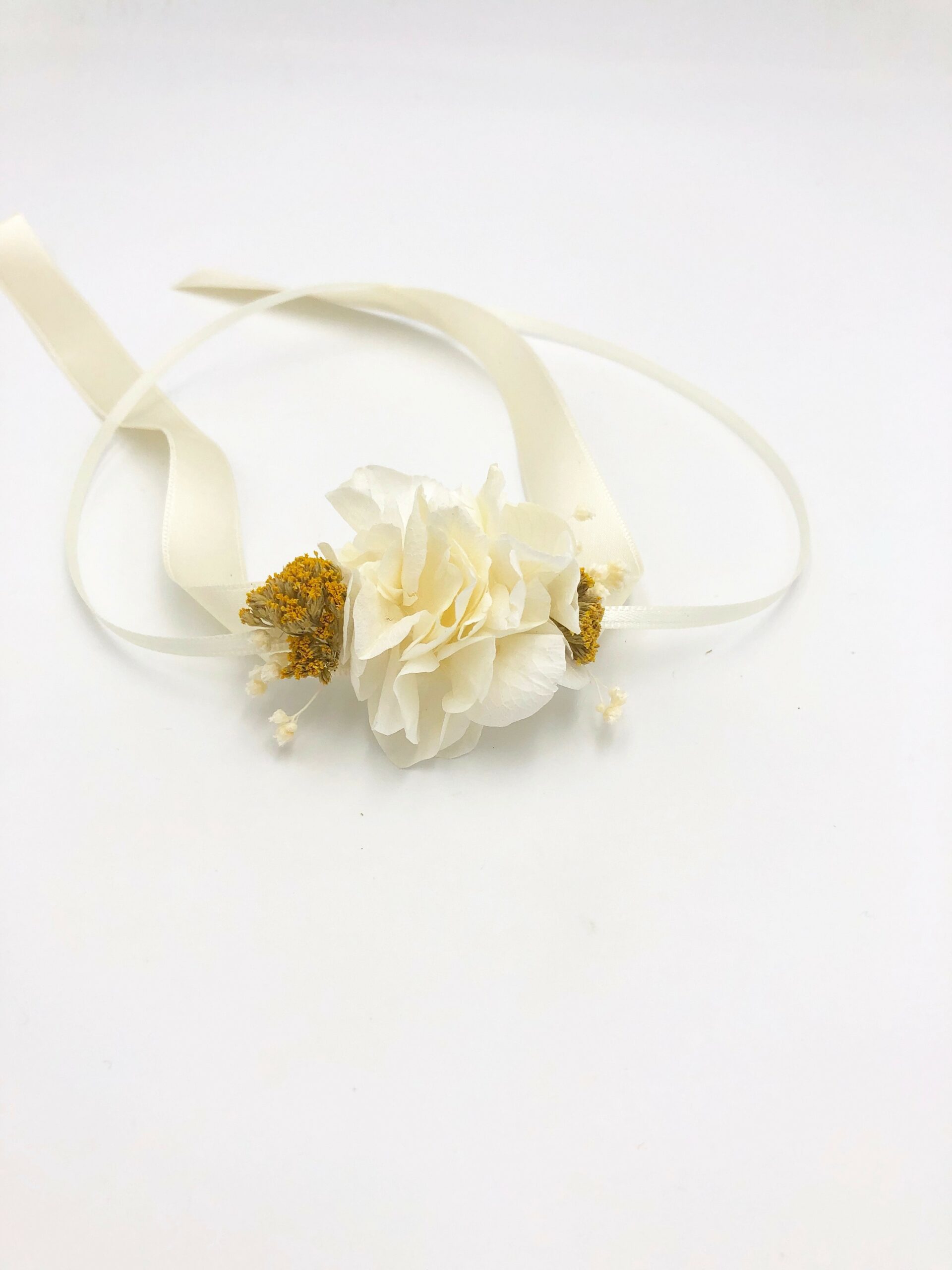 Les bracelets de demoiselles d’honneur Hysope sont un cadeau idéal pour vos plus fidèles alliées. Il se décline, comme la gamme Hysope, sur des tonalités très douces de jaune/moutarde et de blanc, avec des fleurs séchées et stabilisées délicatement posées sur un bracelet ruban des plus agréables à porter.