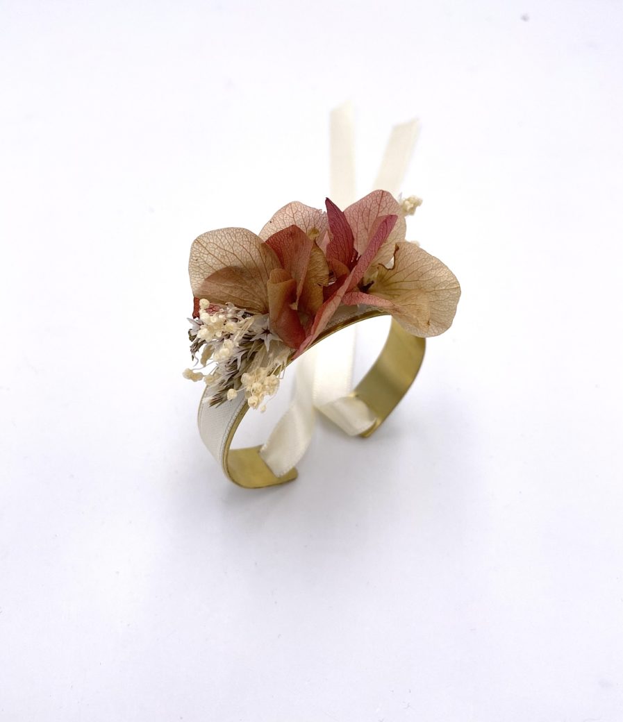 Le bracelet jonc fin Blush se compose d’un mélange d’hortensias stabilisés : rose/crème/blush, pêche, rose pâle et blanc, de statice séché, et de mini gypsophile stabilisé.