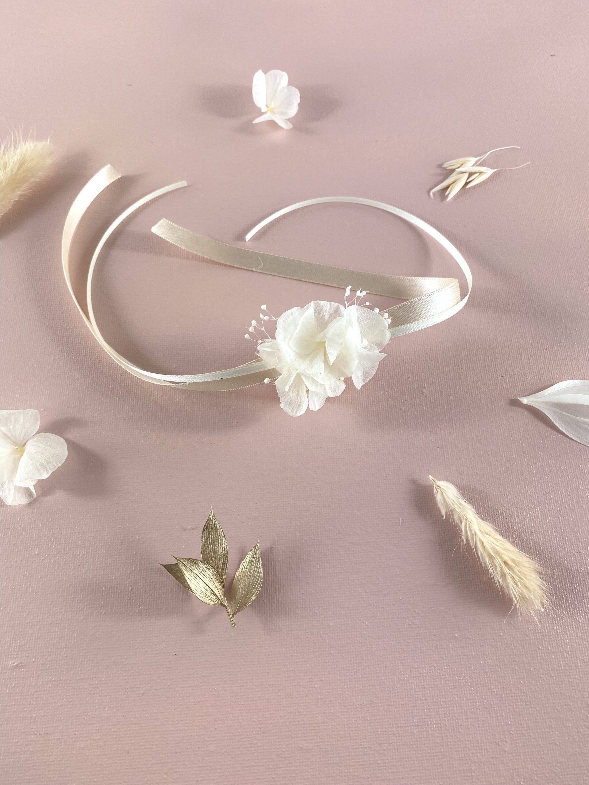 Ce bracelet enfant en fleurs stabilisées blanches se veut simple et délicat, dans la candeur des petites filles, mêlant subtilement des pétales d’hortensia ivoire/blanc et des petits brins de mini gypso blanc. C’est un accessoire lumineux qui pourra s’ajuster facilement au tour de poignet de la la petite fille grâce à son ruban.