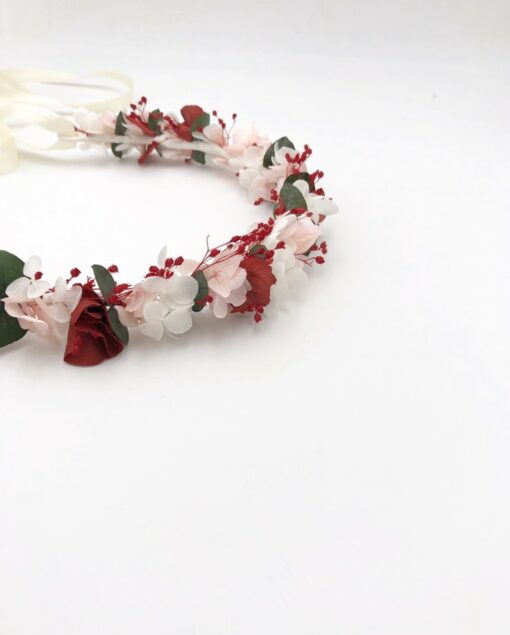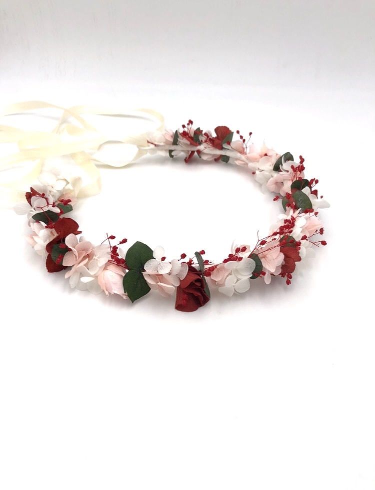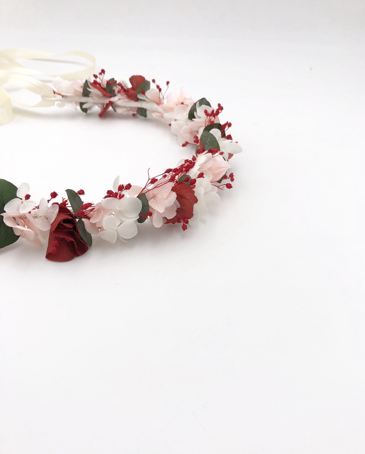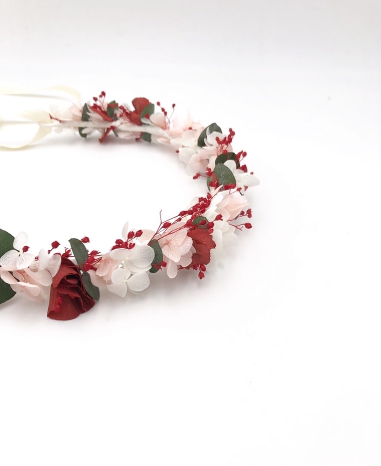 La couronne de fleurs stabilisées Arabesque se compose ainsi de plusieurs fleurs stabilisées : des hortensias stabilisées bordeaux/rouge, rose pâle et blanc, ainsi que des feuilles d’eucalyptus baby blue, un bouton de rose stabilisée rose pâle et des touches de broom stabilisé rouge. C’est un accessoire très frais et estival, aux allures festives et distinguées, qui magnifiera votre tenue par son éclat et son caractère.