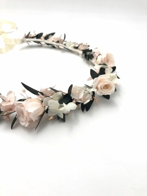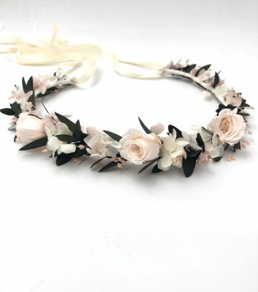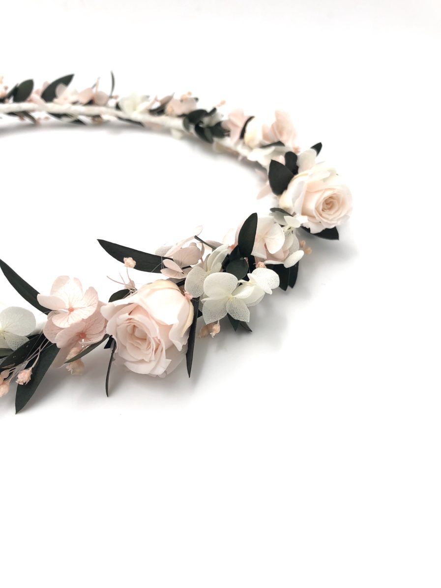 La couronne de fleurs Lima fait partie de la collection romantique, qui se distingue par son contraste entre les tons rose pastel et le végétal de l’eucalyptus. Romantique et chic, cette couronne de mariage est un mélange délicat de plusieurs fleurs stabilisées, et se conservera durant plusieurs années. Il associe ainsi deux petites roses stabilisées, des pétales d’hortensia, de l’eucalyptus et du broom. La gamme Lima, de la collection Romantique, offre une touche très pastel et romantique à votre tenue.