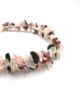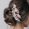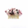 La gamme Tourmaline, et ici la couronne de la mariée, se compose de fleurs naturelles stabilisées : hortensia mini de couleur blanche et rose café, limonium vieux-rose, hortensia rose pâle, fougère blanchie et eucalyptus baby blue. Ce jeu de nuances offre une couronne en fleurs stabilisées résolument moderne, qui garde toutefois une âme tout à fait romantique et délicate. A l’image des reflets verts d’une pierre de tourmaline, cet accessoire de cheveux peut être tantôt vif, tantôt pâle, dévoilant au gré de la lumière les multiples facettes d’un rose subtil et complexe. L’ajout de fines feuilles bien définies de fougère blanchie donne une allure et du caractère à cette couronne.