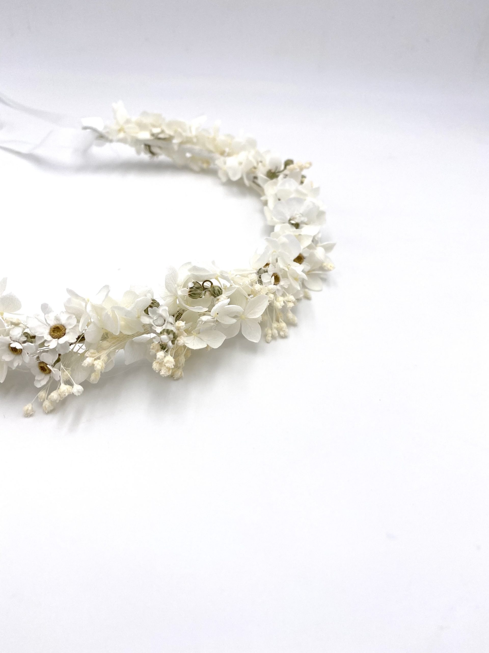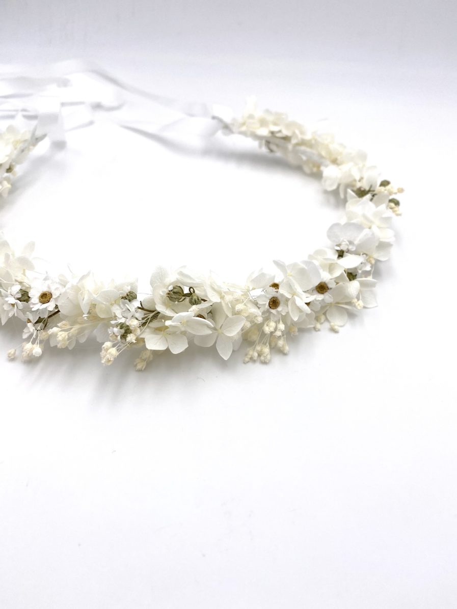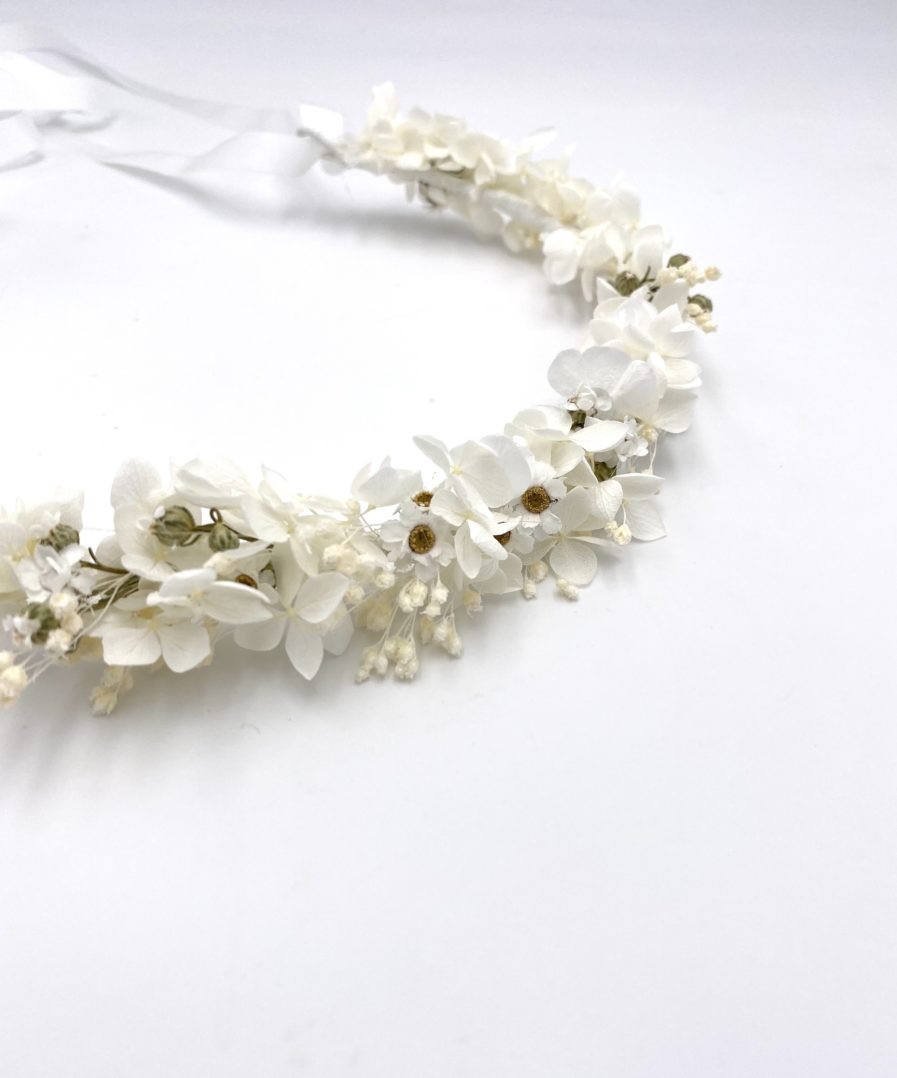La couronne de mariage Candide est réalisée à partir de fleurs séchées et stabilisées, permettant une conservation plusieurs années. Ce côté intemporel est idéal pour commander à l’avance et faire ses essayages sans stresser. Il suffit de conserver la couronne de fleurs dans sa boîte, à l’abri de la lumière directe et d’une forte humidité.