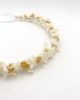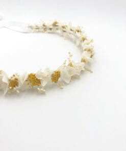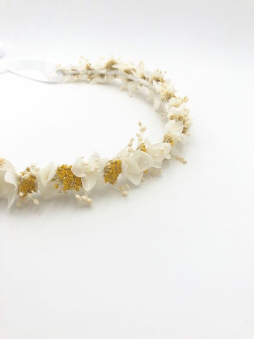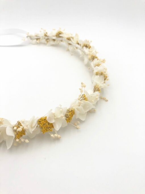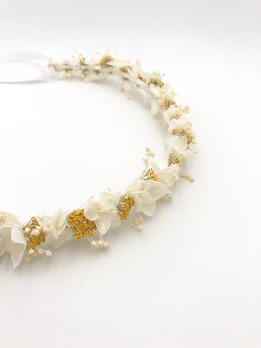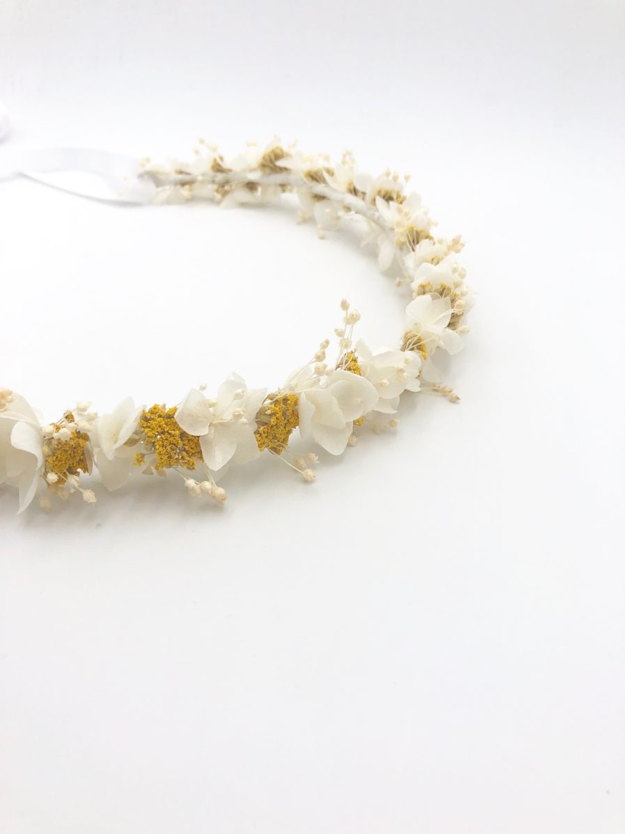 La présence de délicate fleurs aux teintes dorées et moutarde d’achillée jaune, alliées à la blanche pureté des hortensias stabilisées, donne un côté chic et sophistiqué à votre style, et permet de sublimer votre robe de mariée. La couronne de fleurs Hysope est une alternative à la couronne Aura, avec ses brins de lin dorés, sur des tons davantage moutarde, qui peuvent très bien convenir pour s’associer à un costume du marié original ou à un détail de sa tenue. Cette couleur moutarde s’inscrit parfaitement dans la tendance et pourra s’associer à merveille avec des teintes bleutées.