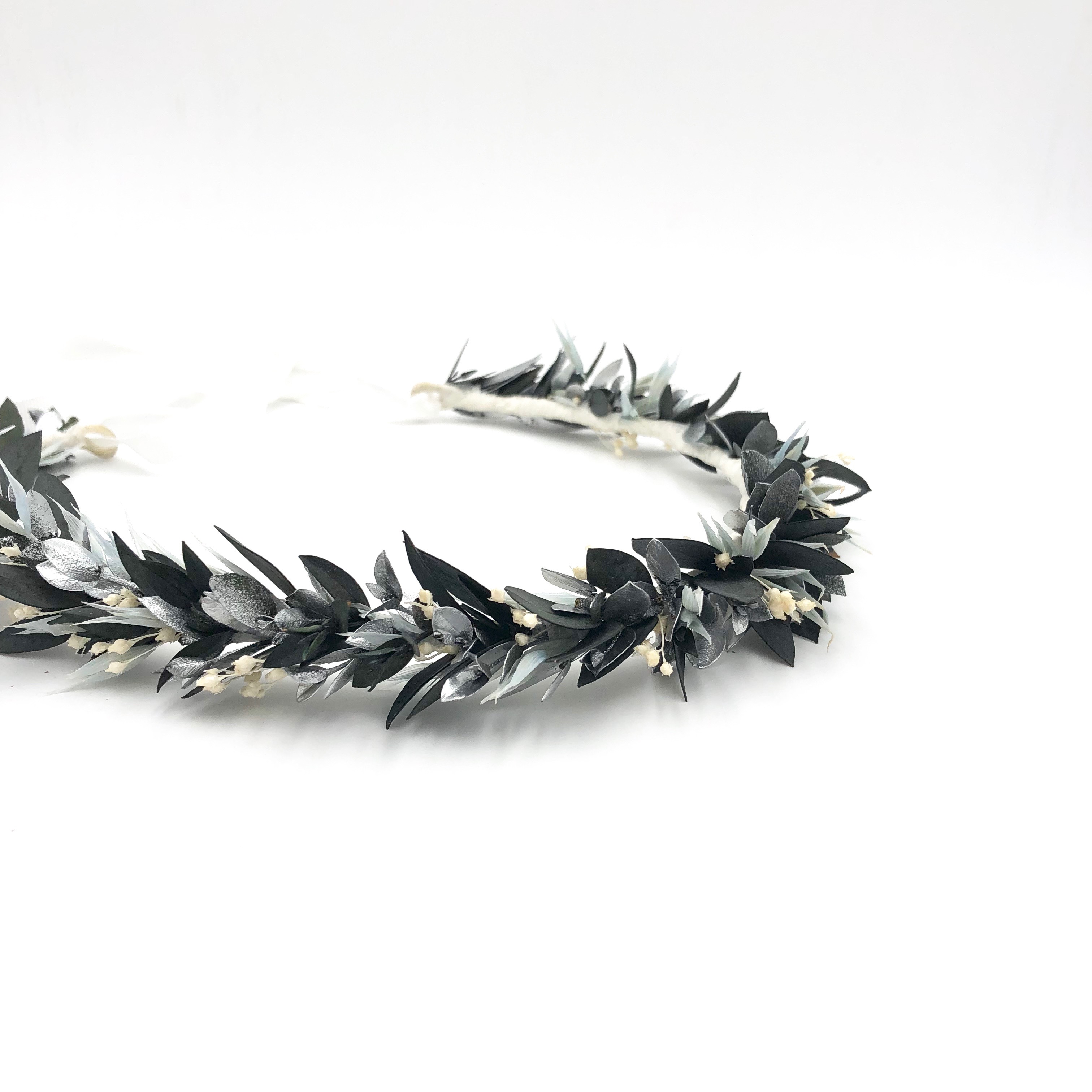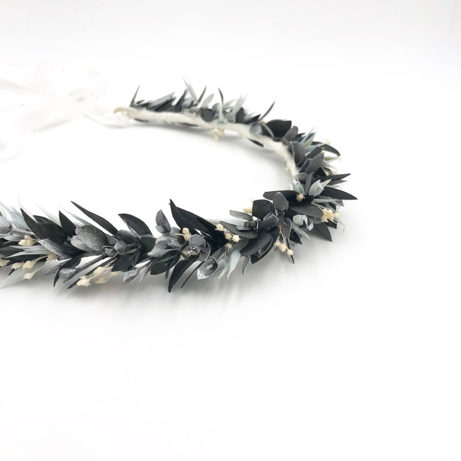La couronne de mariage Turquin est une des trois déclinaisons de la collection Orichalque. Pièce originale et rafraîchissante, elle mêle plusieurs tonalités douces et lumineuses, contrastées avec des couleurs plus froides, donnant un ensemble à la fois moderne et particulièrement élégant. En effet, cette couronne de fleurs associe le bleu clair de l’avoine séché, le vert de l’eucalyptus au naturel, le blanc de billes de broom et l’argenté lumineux d’eucalyptus teintés. S’inscrivant à la fois dans la tendance du bleu pour les mariages, et dans un esprit très bijou avec ses reflets d’argent, la couronne de mariage Turquin est une pièce phare qui sublimera la tenue de nombreuses mariées.
