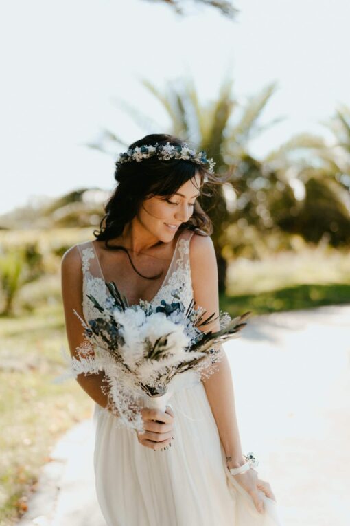La couronne en fleurs stabilisées Acqua est une création aux accents bohème, mais à l’esprit moderne, offrant un bijou de fleurs durables à la mariée d’aujourd’hui. Elle pourra s’associer avec goût aux autres accessoires de la même gamme pour les demoiselles d’honneur, comme les bracelets ou les mini barrettes, ainsi qu’aux témoins avec les boutonnières.