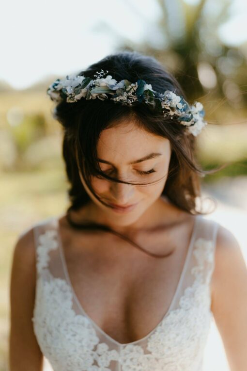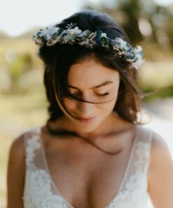 Comme nos autres accessoires pour la mariée, cette couronne se compose de fleurs 100% naturelles durables, stabilisées, qui offrent des avantages en matière de conservation, allant de plusieurs mois à plusieurs années. Pratique pour commander quelques mois avant, et pour la conserver ensuite en souvenir des années.