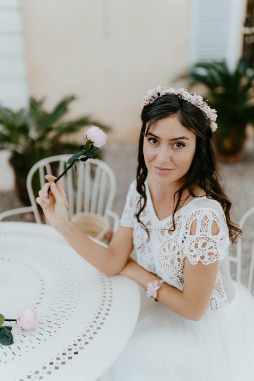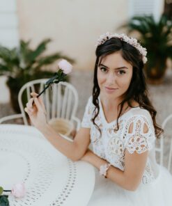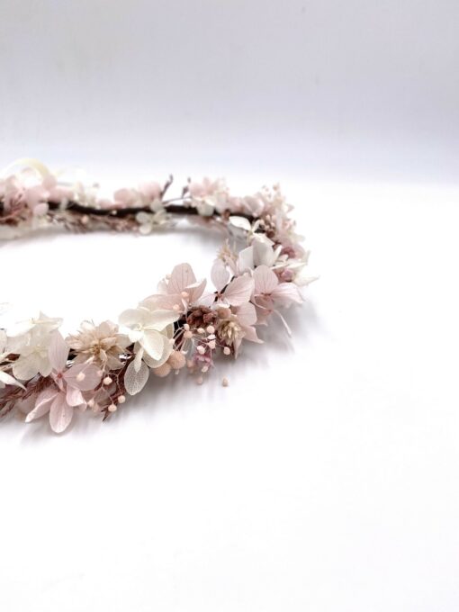 La couronne en fleurs stabilisées et séchées Chérie fait partie de la collection Chérie, une gamme d’accessoires déclinés autour des tonalités vieux-rose, litchi, rose vintage et blanc, respirant le bonheur et la féminité.