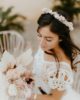 La couronne, grand classique des accessoires de la mariée contemporaine, est ici déclinée de façon moderne et délicate, fine et travaillée, avec un joli jeu de textures et de dégradés. Elle pourra alors se porter cheveux lâchés, pour un look plus bohème, mais également de façon plus sophistiquée, sur un chignon et cheveux tirés.
