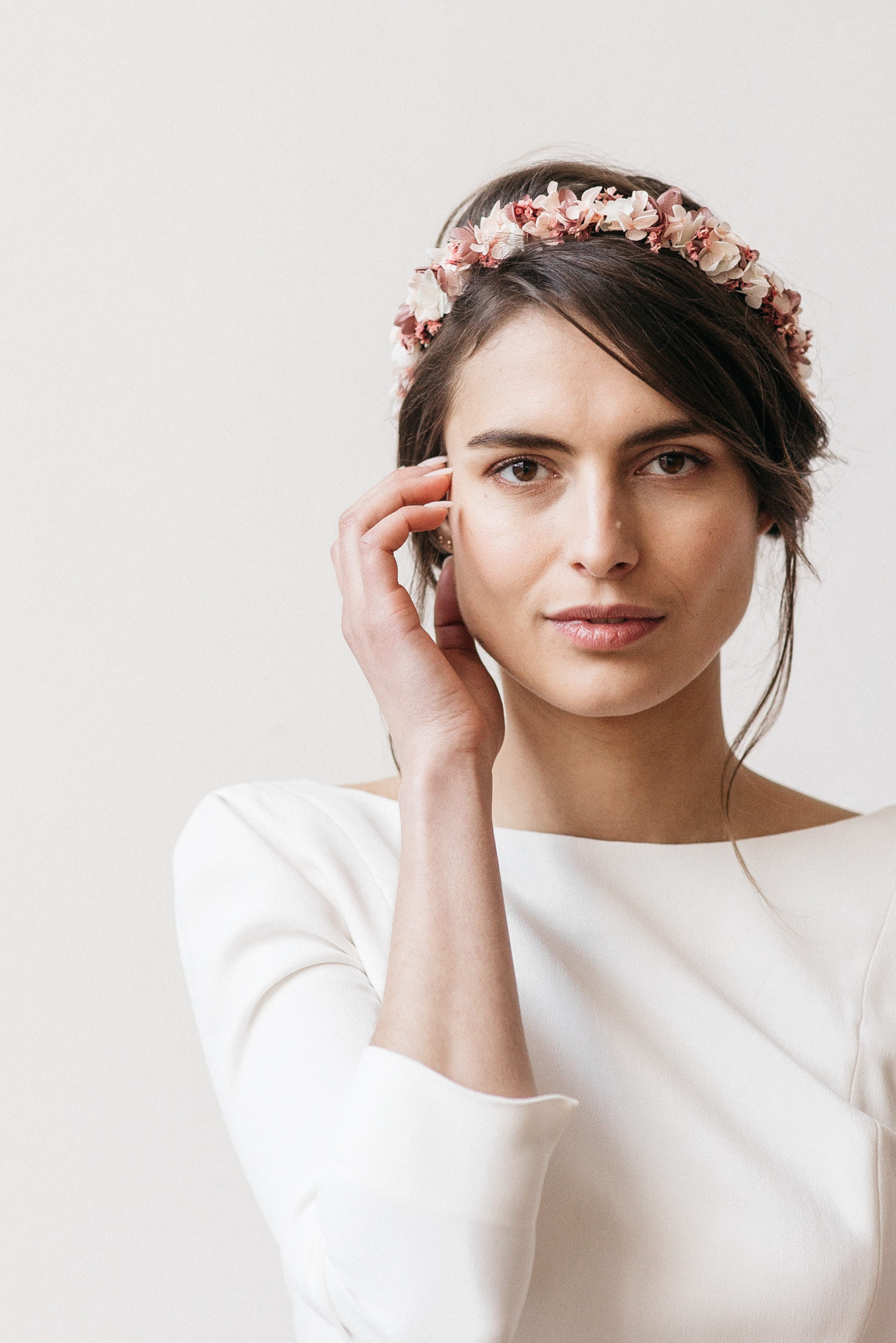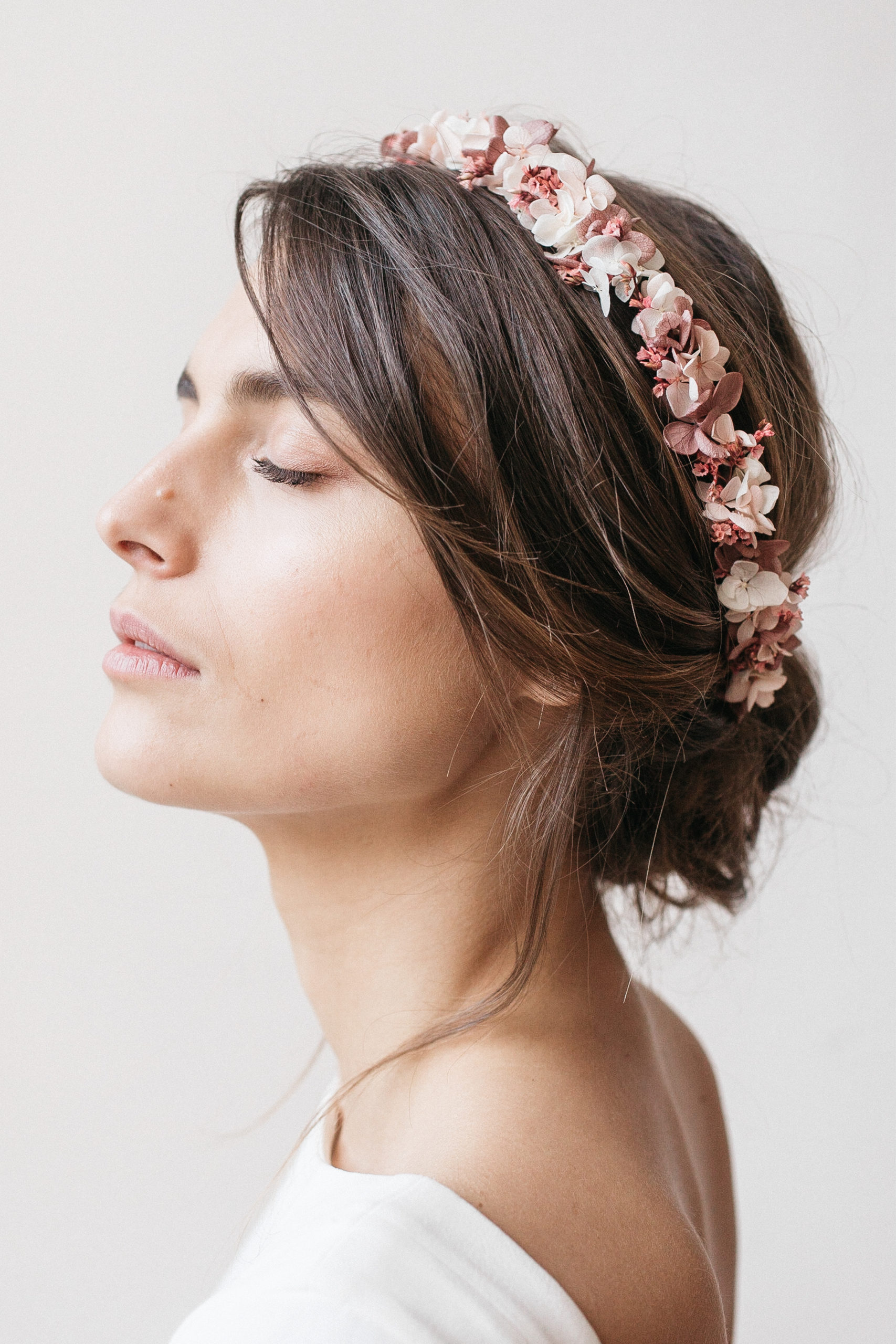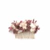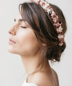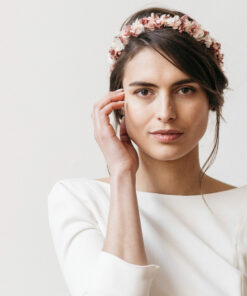 La couronne en fleurs stabilisées Quartz décline les accessoires fleuris autour de la couleur vieux-rose, avec des tons doux et puissants. Avec sa thématique de pierres précieuses, cette collection fait des couronnes et autres peignes de véritables bijoux de fleurs, destinés à la mariée moderne et romantique. Ces créations en fleurs stabilisées se démarquent par un travail sur la minutie, la délicatesse et la sophistication des contrastes de couleurs, à la fois saisissants et doux.