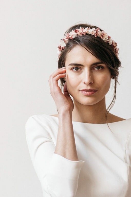 La gamme Quartz, et ici la couronne Quartz, se compose de fleurs naturelles stabilisées : hortensia mini de couleur blanche et rose café, limonium vieux-rose, iris, et hortensia rose pâle. Ce jeu de nuances offre une couronne de mariée résolument moderne, qui garde toutefois une âme tout à fait romantique et délicate. Comme les reflets d’une pierre de quartz, cette couronne offre des tons tantôt vifs, tantôt pâles, dévoilant au gré de la lumière les multiples facettes d’un rose subtil et complexe.