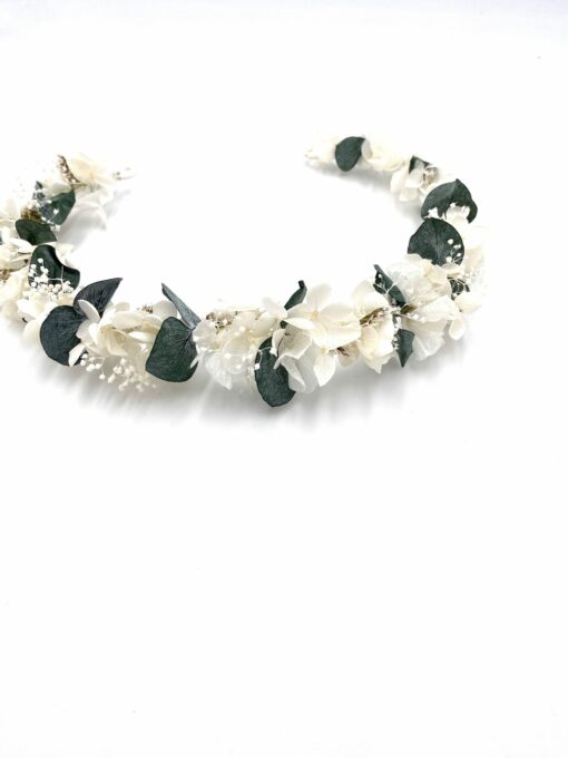 La couronne en fleurs stabilisées Calypto se compose d’un mélange d’hortensias stabilisés, de mini gypsophile stabilisé avec ses brins délicats, et de feuilles d’eucalyptus baby blue.