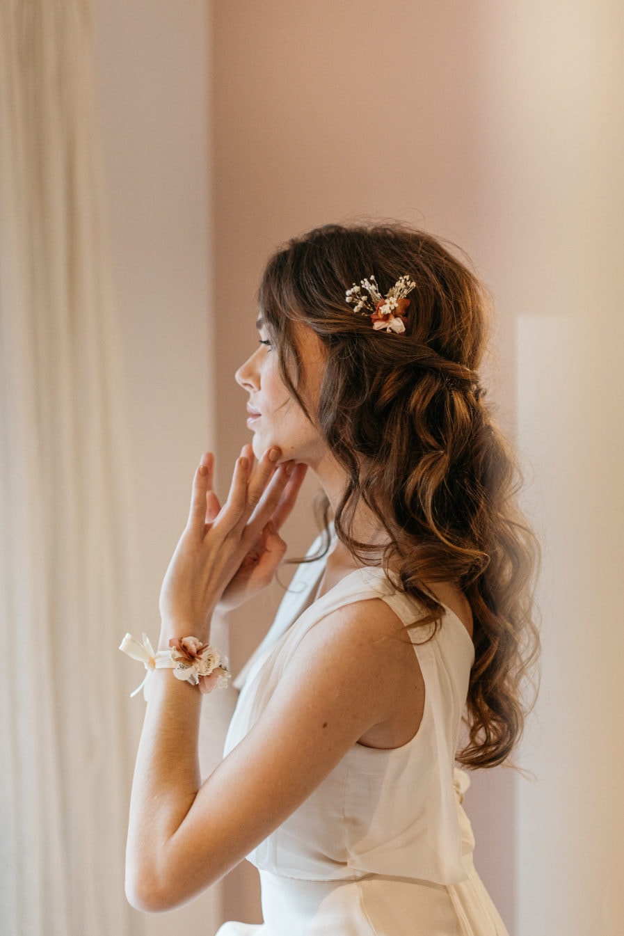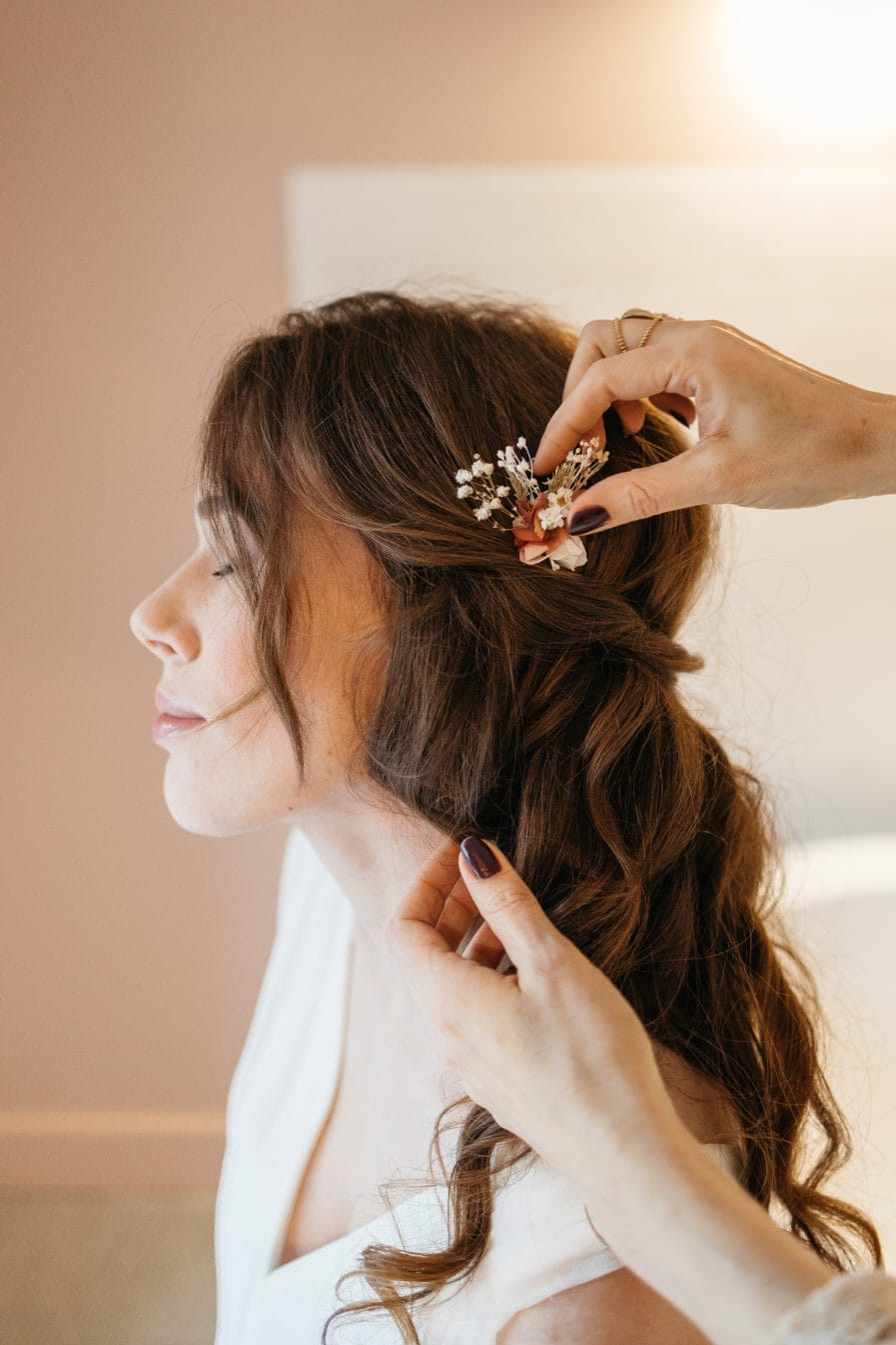 Le blush fait également écho à la douceur de tonalités pastels, à cet instant où la mariée se fait pomponner, étoile d’un jour, entourée de ses demoiselles d’honneur, dans des moments de complicité rare et de joie intense.