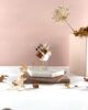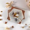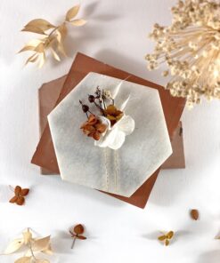 Safran met à l’honneur les tons chatoyants de l’automne, avec de doux dégradés de couleurs safran, ocre, terracotta et nude, mêlant des hortensias mini, allant du safran à l’ivoire, du limonium, et des petites fleurs séchées, comme les immortelles de couleur nude, de l’avoine blanchi et des billes de lin marron.