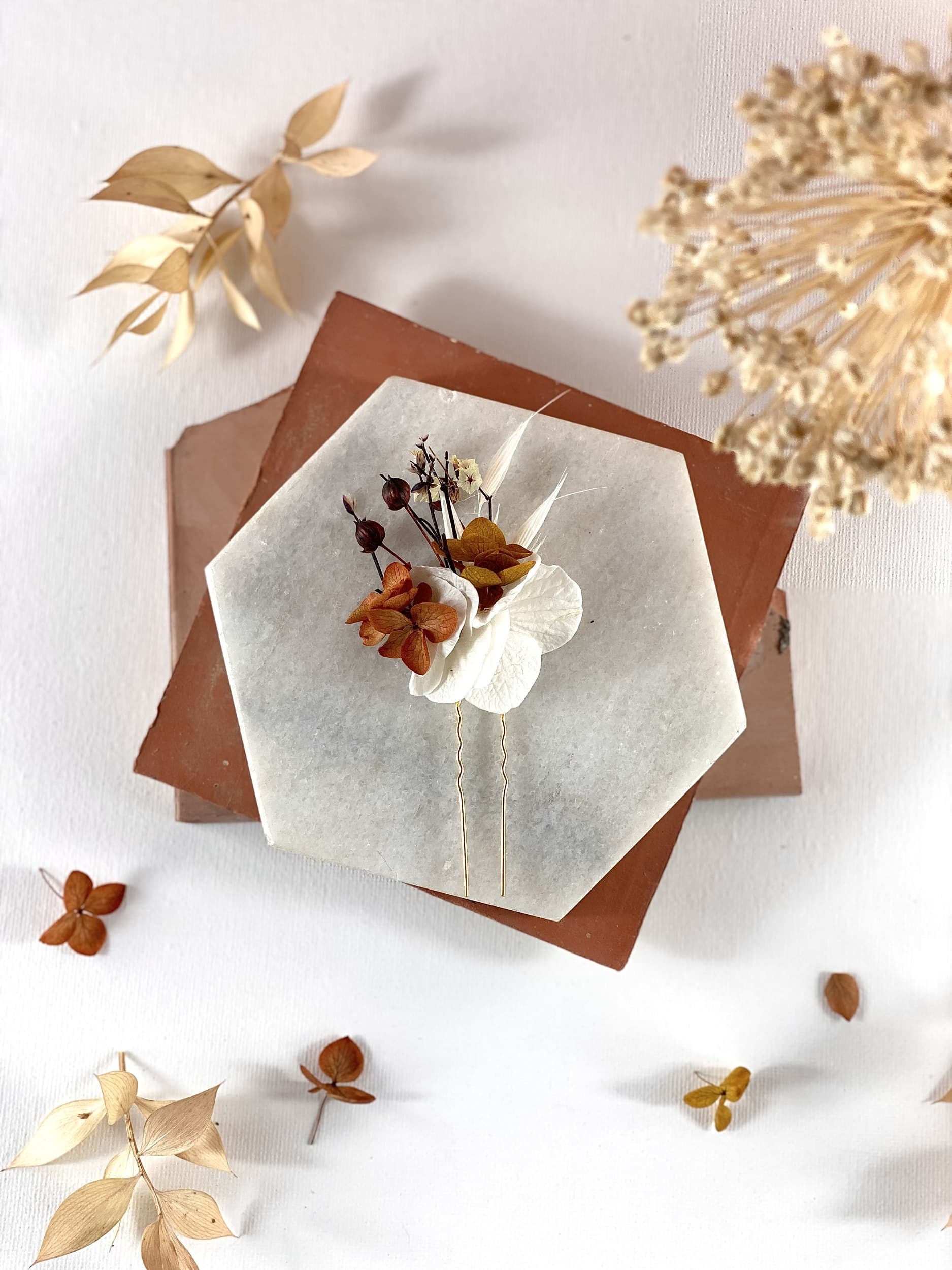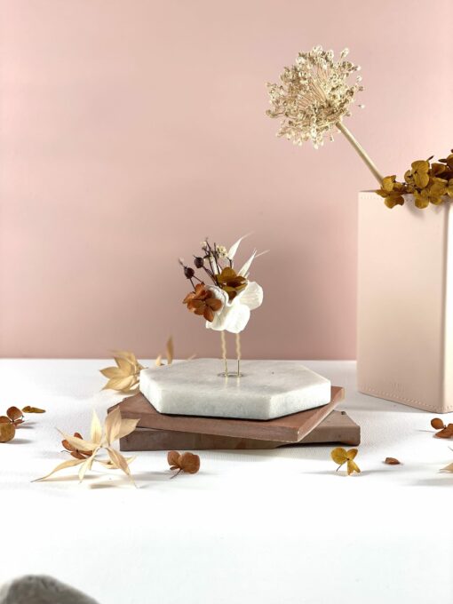 Le grand pic en fleurs stabilisées Safran fait partie d’une collection limitée à quelques pièces, déclinée sur les accessoires que sont la couronne, le peigne, le peigne mini, le headband mini et bracelet/boutonnière.