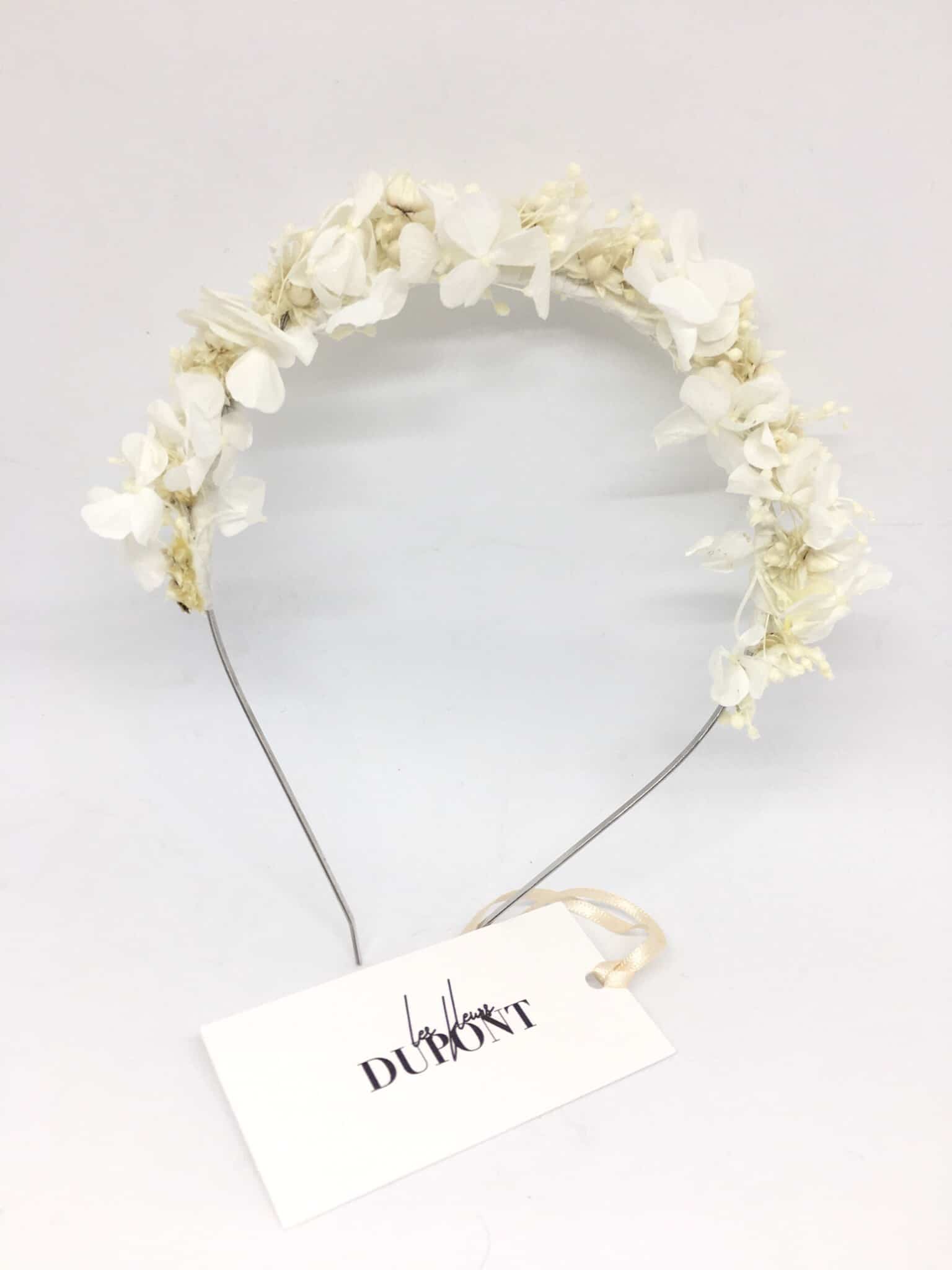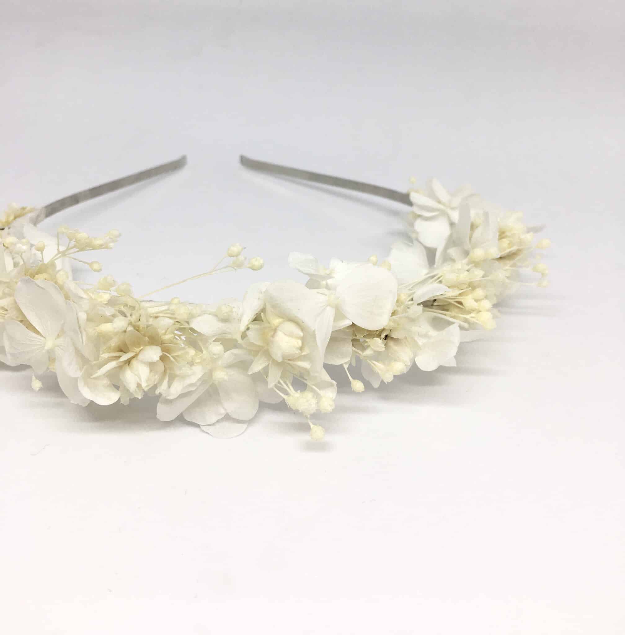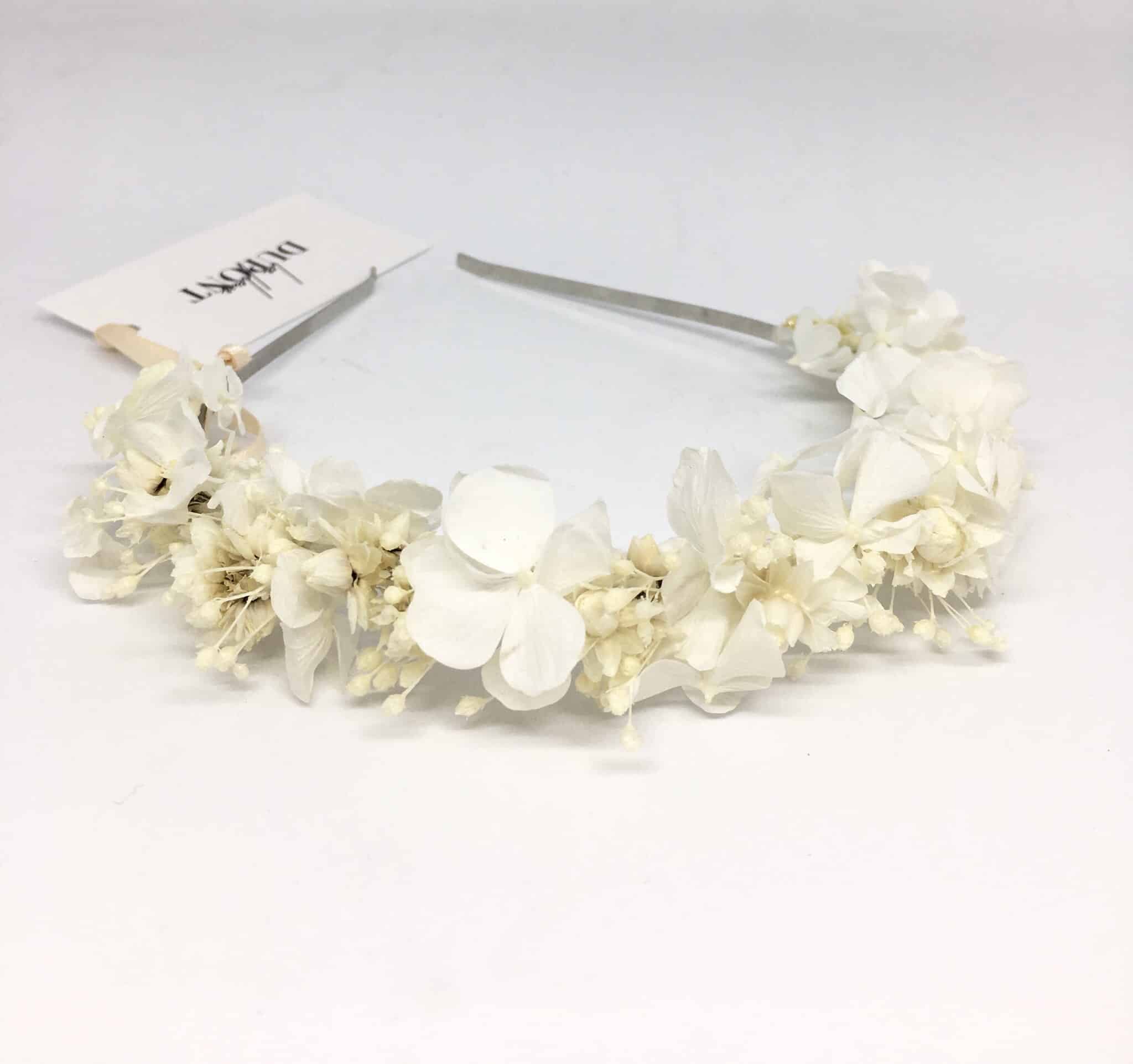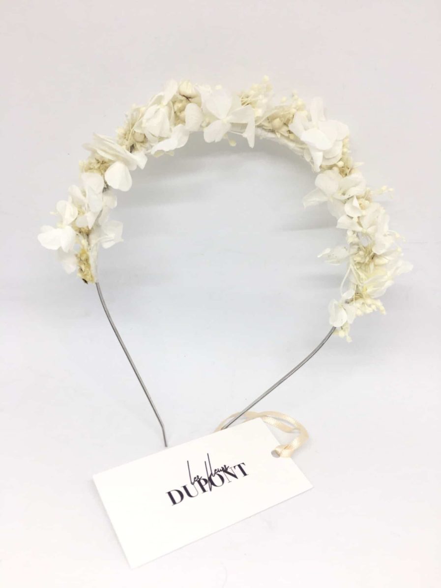 Le headband de mariage Candide est un accessoire doux et délicat, qui met l’accent sur la pureté, avec des fleurs d’Ammobium blanches entremêlées de fleurs d’Hortensia mini stabilisées, alliant joliment les tons blancs et ivoire. Comme le peigne de mariage de la même collection, Candide vous assure cette touche blanche discrète et élégante, qui se marie parfaitement avec votre robe.
