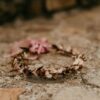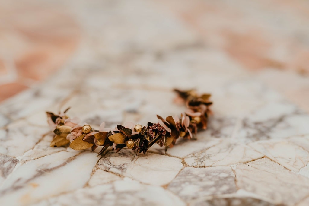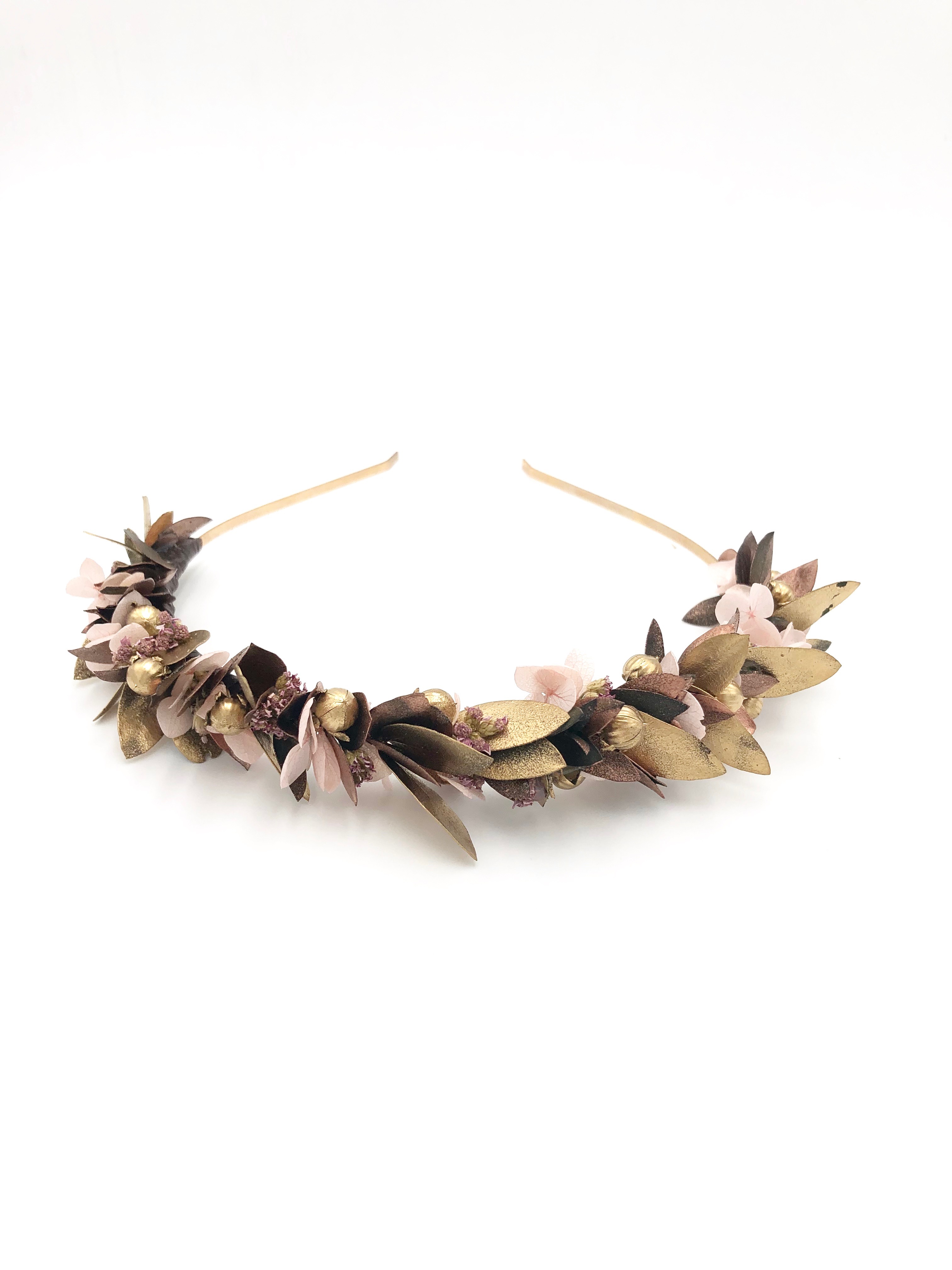 L’aspect précieux de ce serre-tête de mariage pourrait faire croire qu’il est constitué en partie de pierres ou de métal. Pourtant, il est uniquement réalisé à la main à partir de fleurs naturelles : fleurs séchées françaises comme les billes de lin ensuite dorées par nos soins, ou les achillées à la douce couleur rose, et fleurs stabilisées, avec les feuilles d’eucalyptus dorées et de délicats pétales d’hortensia rose. C’est un mélange de couleurs original et très fin, le rose s’alliant à merveille aux teintes patinées et passées d’un cuivre presque mythique.
