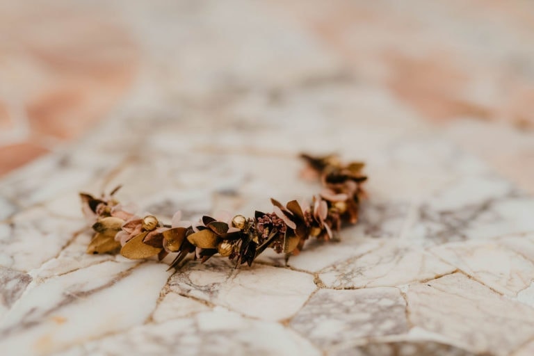 Le headband de mariage Phyra est l’une de nos pièces créées dans le cadre de la collection Orichalque, qui introduit des tons cuivrés, bronze, et rose pastel à cet univers antique et minéral. S’inscrivant dans l’idée d’accessoires chics aux airs de bijoux de métaux précieux, la gamme Phyra offre un côté romantique et doux, et son mélange de couleurs sophistiqué s’associe à merveille avec certains des tons les plus en vogue des mariages, comme le cuivré, le doré ou l’aspect laiton. Le headband de fleurs Phyra permet de porter un accessoire très chic de différentes manières, et sa légèreté est très appréciable pour pouvoir l’arborer durant une journée entière et une nuit !