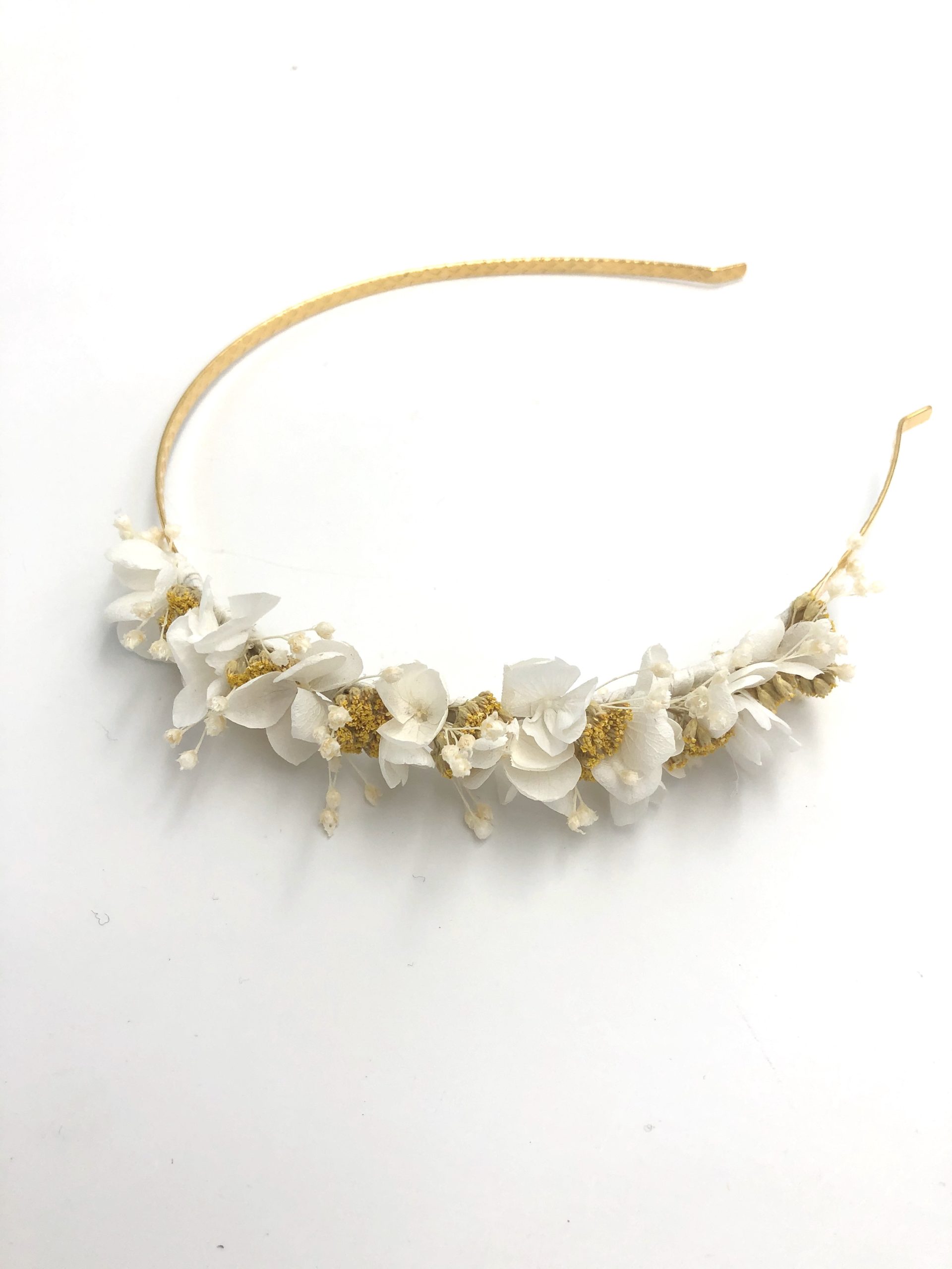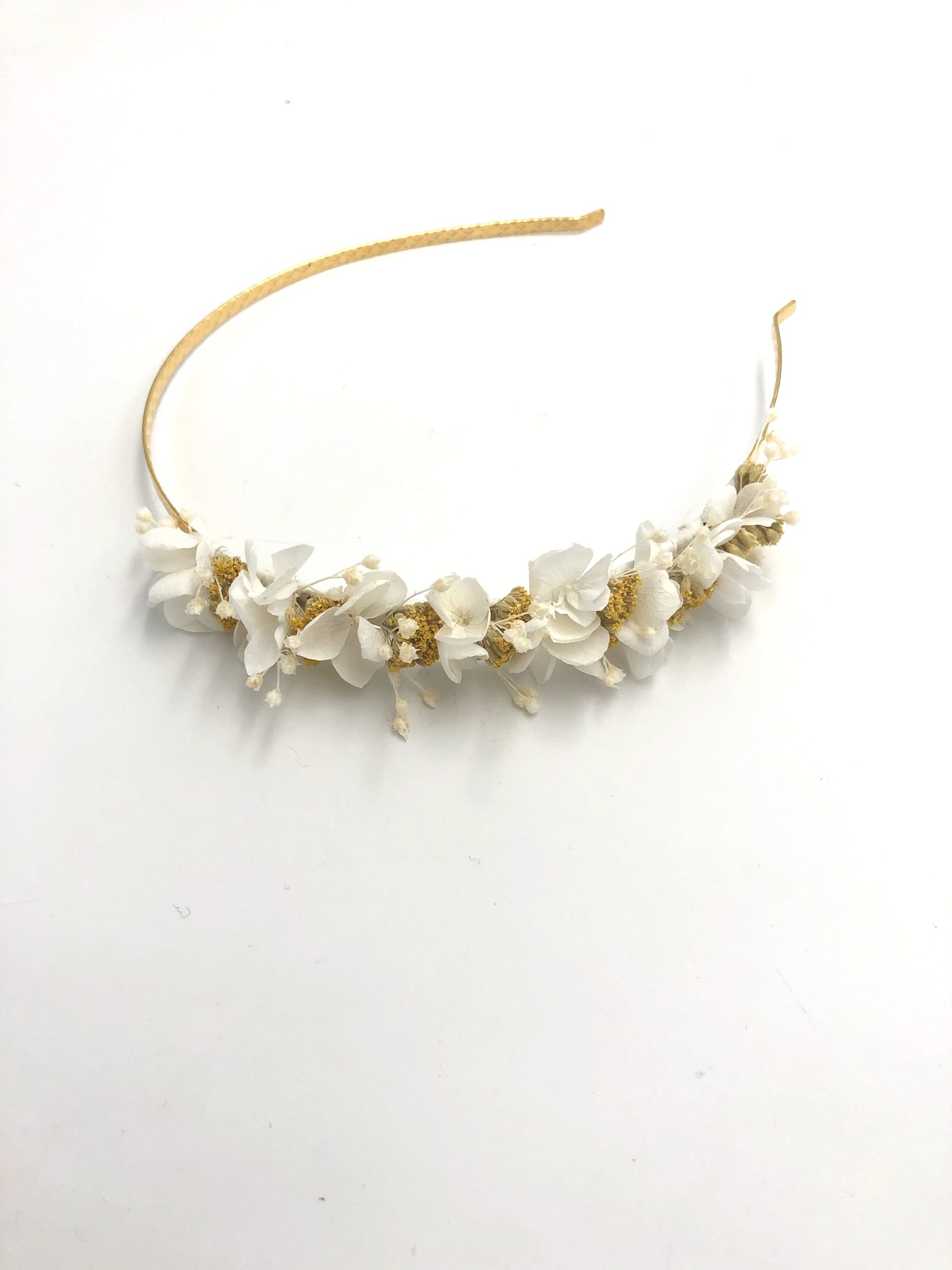 Le headband de mariée mini Hysope se compose d’achillées jaunes séchées et d’hortensia blancs stabilisés.