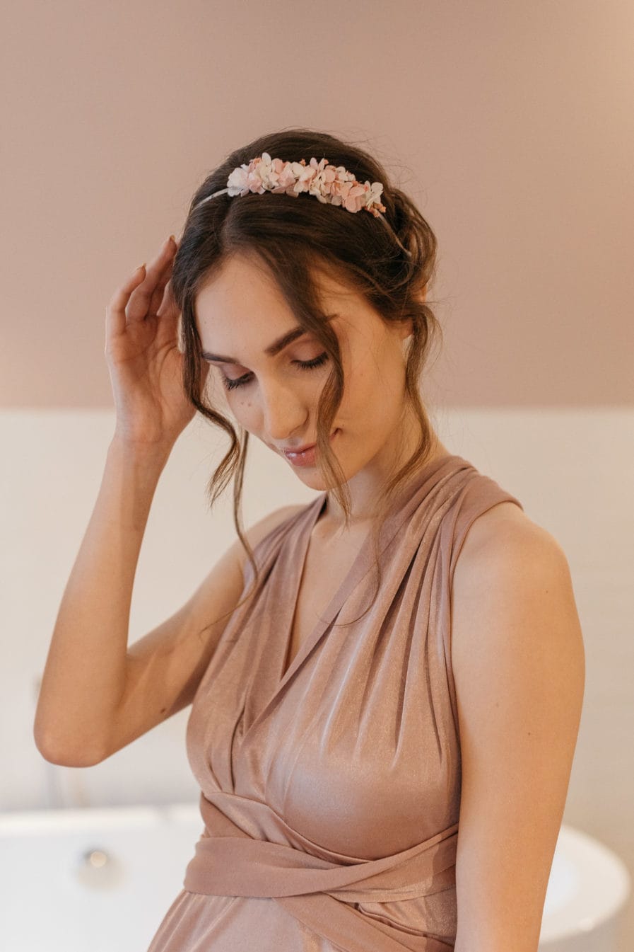Le nom Candi fait référence à l’action de confire et cristalliser le sucre, et illustre parfaitement les petites touches sucrées de rose poudré et de blanc qui ornent la couronne. Elle est idéale pour les mariées souhaitant apporter une touche discrète et délicate de rose à leur tenue.