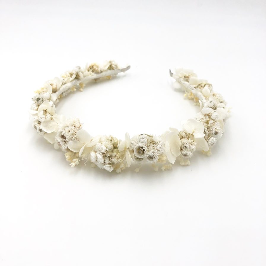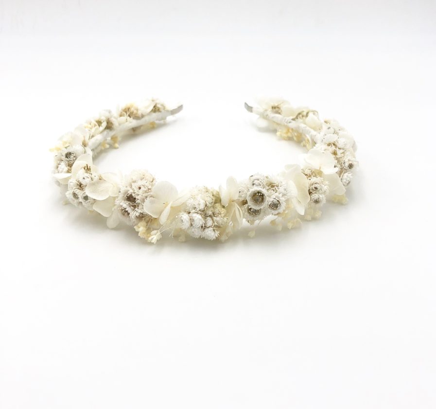 Le headband de mariage Immortelle évoque la douceur et la force d’un amour pur avec ses généreuses fleurs d’Immortelles blanches constituées en mini bouquets. Il est une véritable ode à l’amour. Son design entremêle avec raffinement la rondeur des fleurs d’Immortelles et les délicates fleurs d’Hortensia blanches. Il se décline dans les tons blancs et ivoires. Cet accessoire de mariage s’adaptera à de nombreuses coiffures, sur cheveux détachées ou attachés. Il sera le cadeau idéal à offrir à ses demoiselles d’honneur.