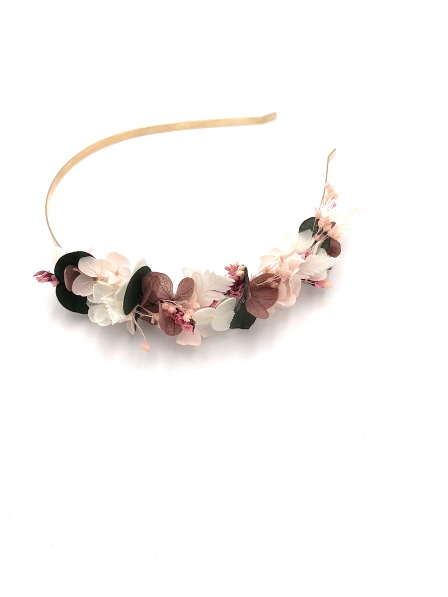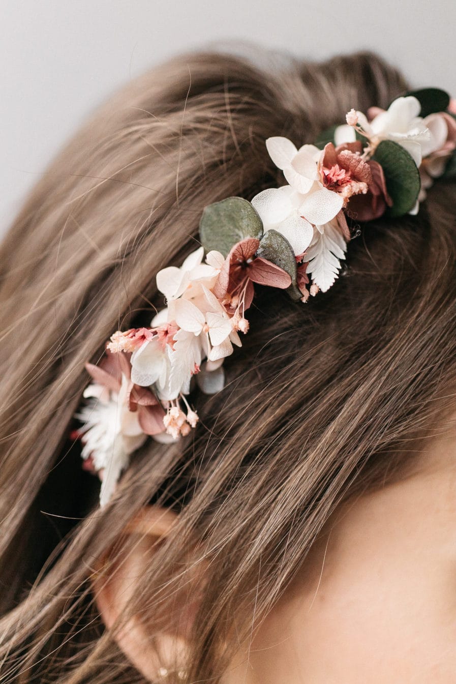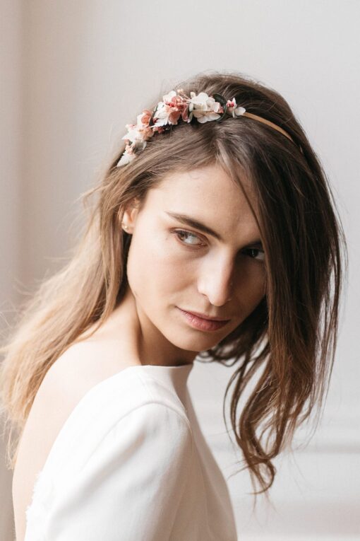 Cette version mini du headband permet d’offrir à la mariée la touche fleurie idéale en proportion, pour celles souhaitant un accessoire en fleur présent mais toutefois assez discret. L’un de ses avantages est également sa facilité de pose sur les cheveux, quels qu’en soient le type ou la coupe. En effet, le headband mini est tout à fait adapté à des cheveux au carré mais également à des cheveux courts et fins. C’est une bonne alternative pour les mariées aux cheveux courts à la recherche d’un bijou de tête fleuri délicat et discret.