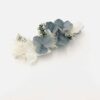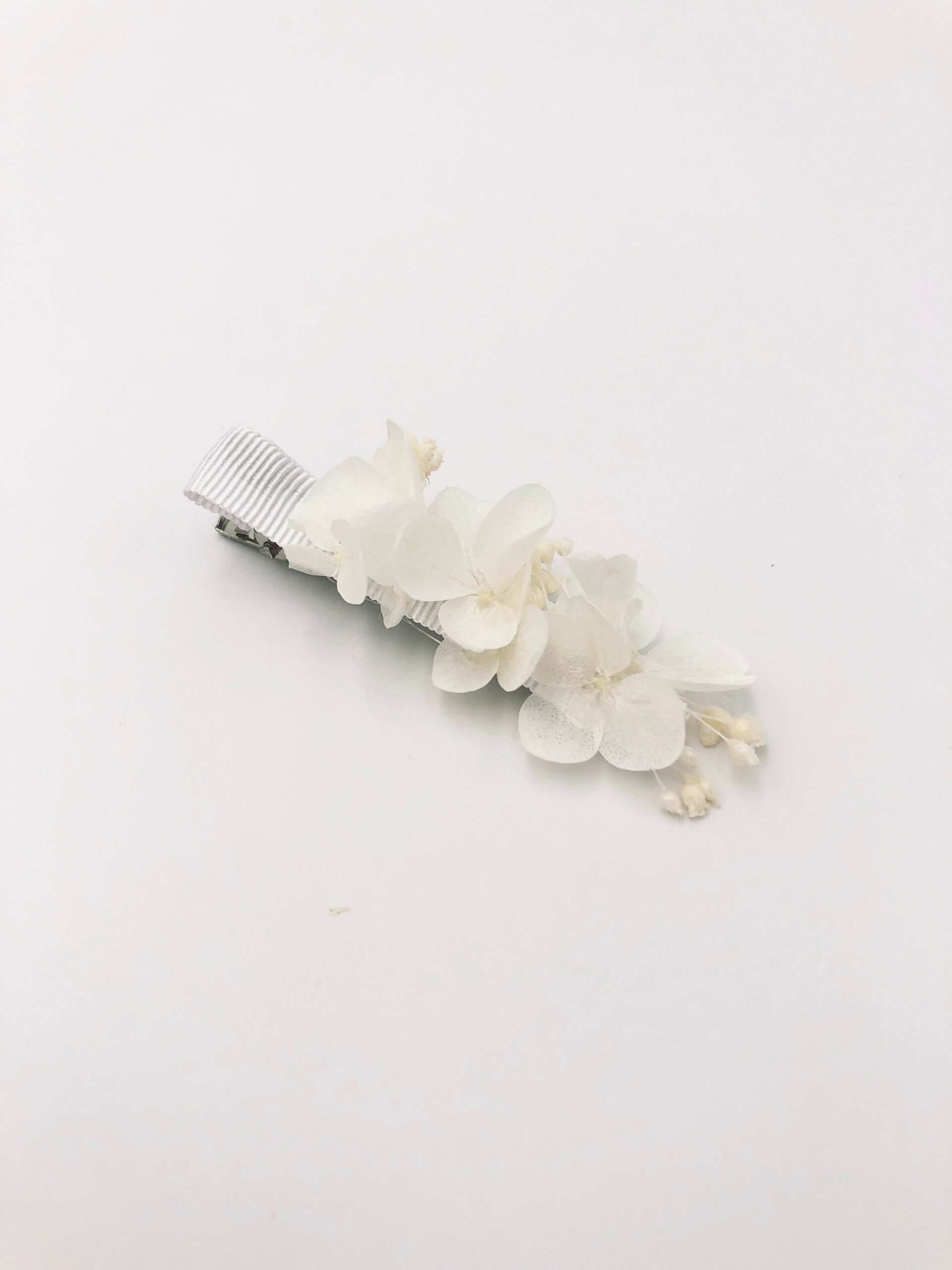 Cette mini barrette blanche est composée de fleurs stabilisées : broom blanc et hortensia blanc mini.