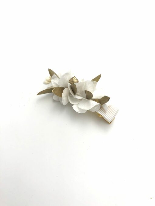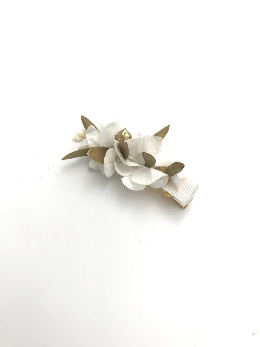 Les Fleurs Dupont vous proposent avec cette mini barrette dorée en fleurs stabilisées et séchées, un accessoire pour la demoiselle d’honneur, l’invitée, ou pour la mariée, et notamment les petites filles, qui apporte une touche fleurie discrète et élégante, et très facile à porter.