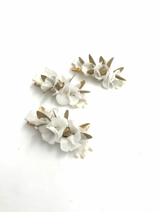 La mini barrette blanche fleurie est une version qui peut aussi bien convenir aux gammes Aura ou Ori, par exemple pour accompagner un peigne, ou encore une couronne.