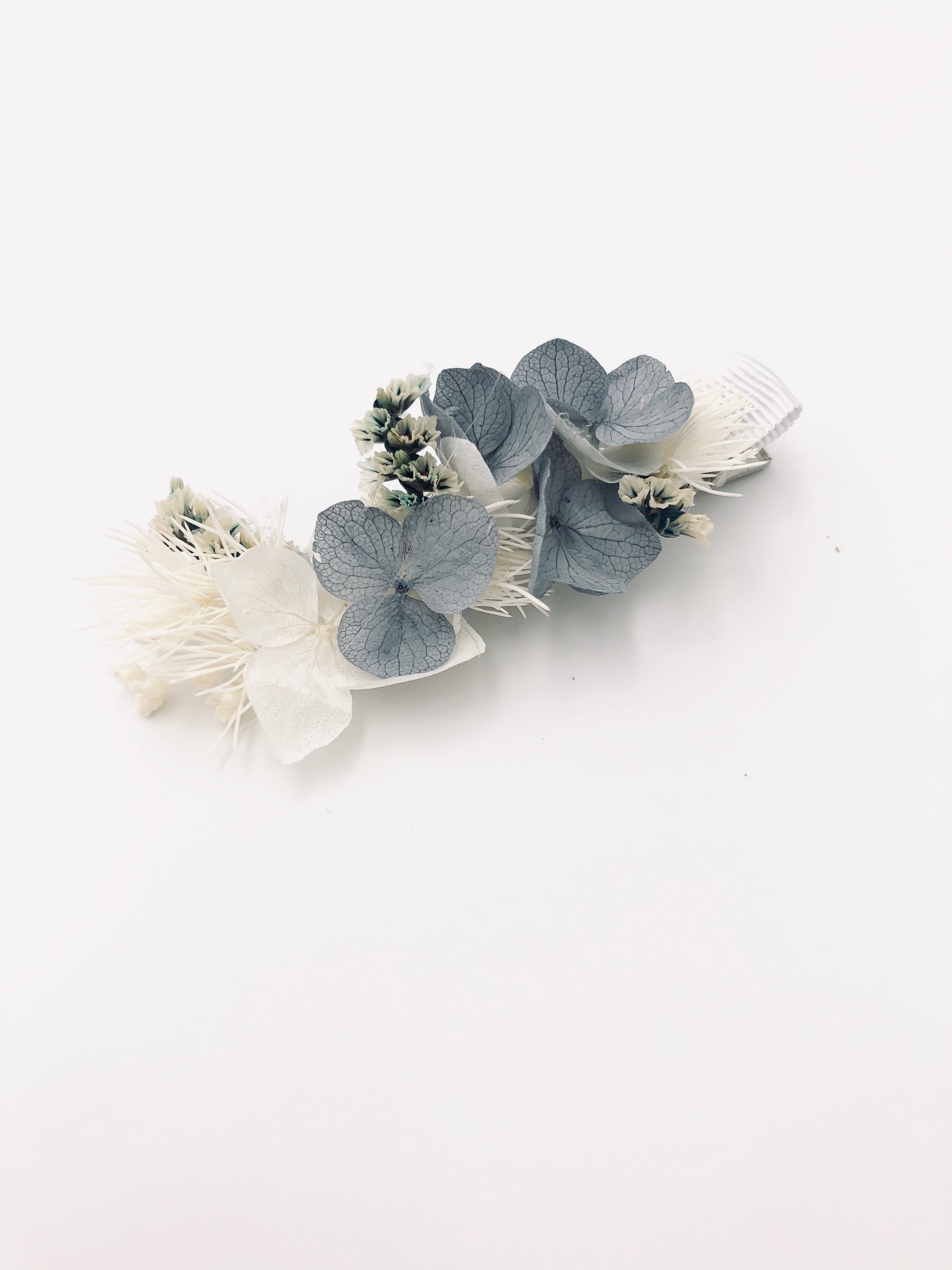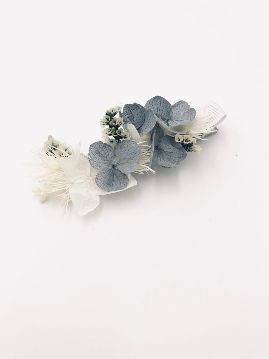 La mini barrette Horizon est une version aux coloris très doux, qui sublimera instantanément une coiffure, aussi bien sur le côté qu’à l’arrière de la tête. Composée exclusivement de fleurs stabilisées, avec des hortensias bleus-gris ou encore des touches d’asparagus blanc, ce petit accessoire de cheveux est lumineux et sophistiqué.