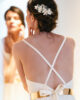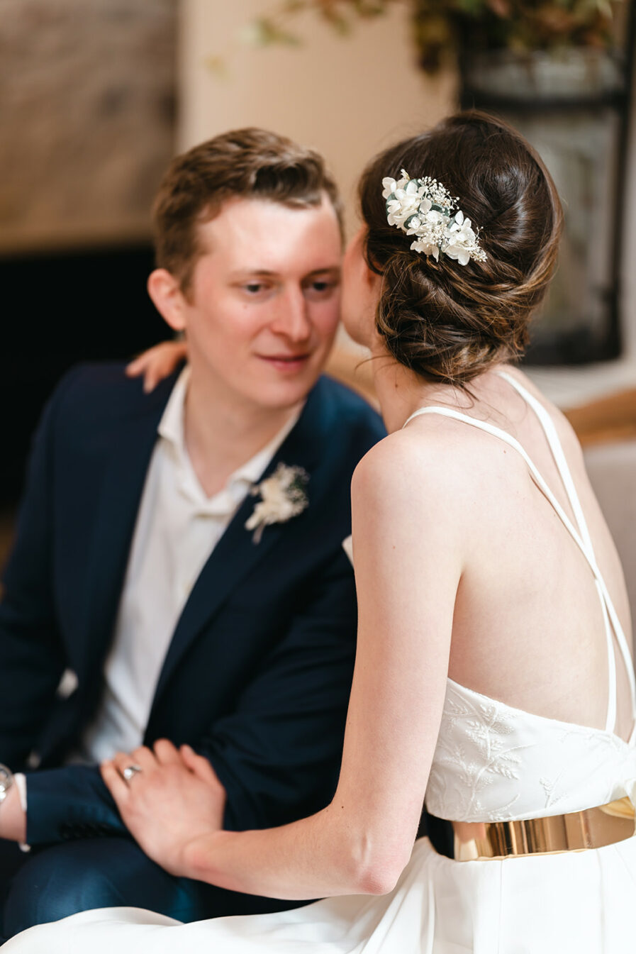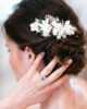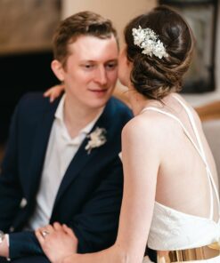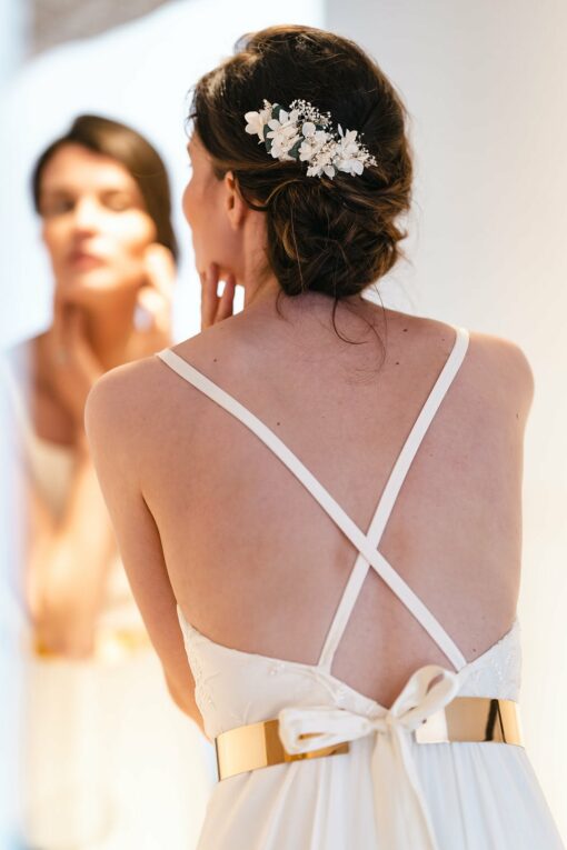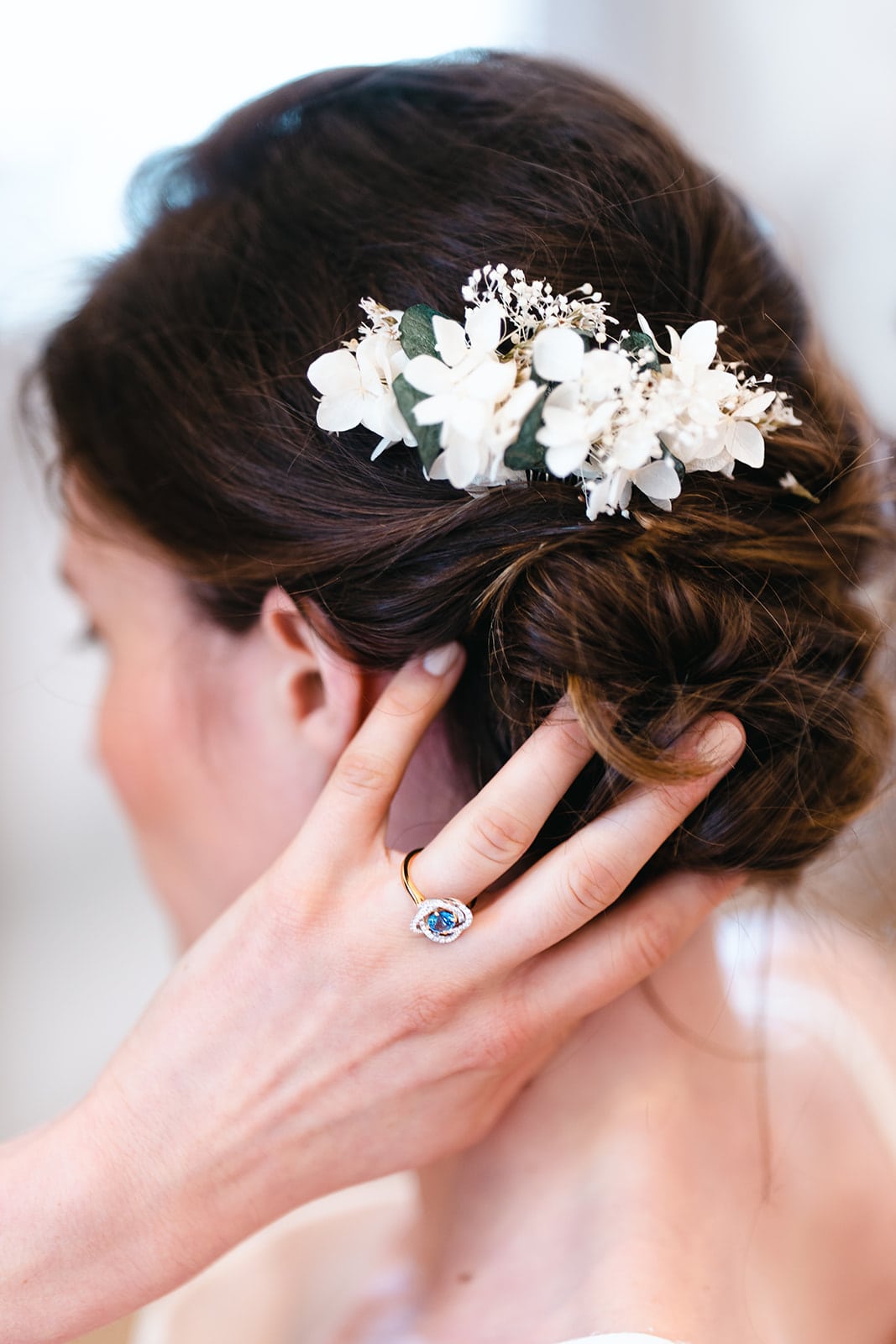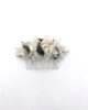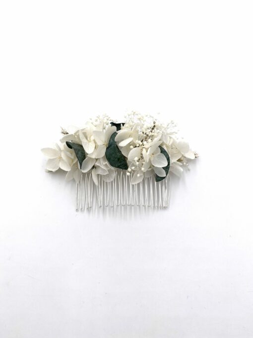 Le peigne de fleurs Calypto est composé d’un mélange d’hortensias stabilisés, de mini gypsophile blanc et d’eucalyptus baby blue.