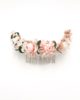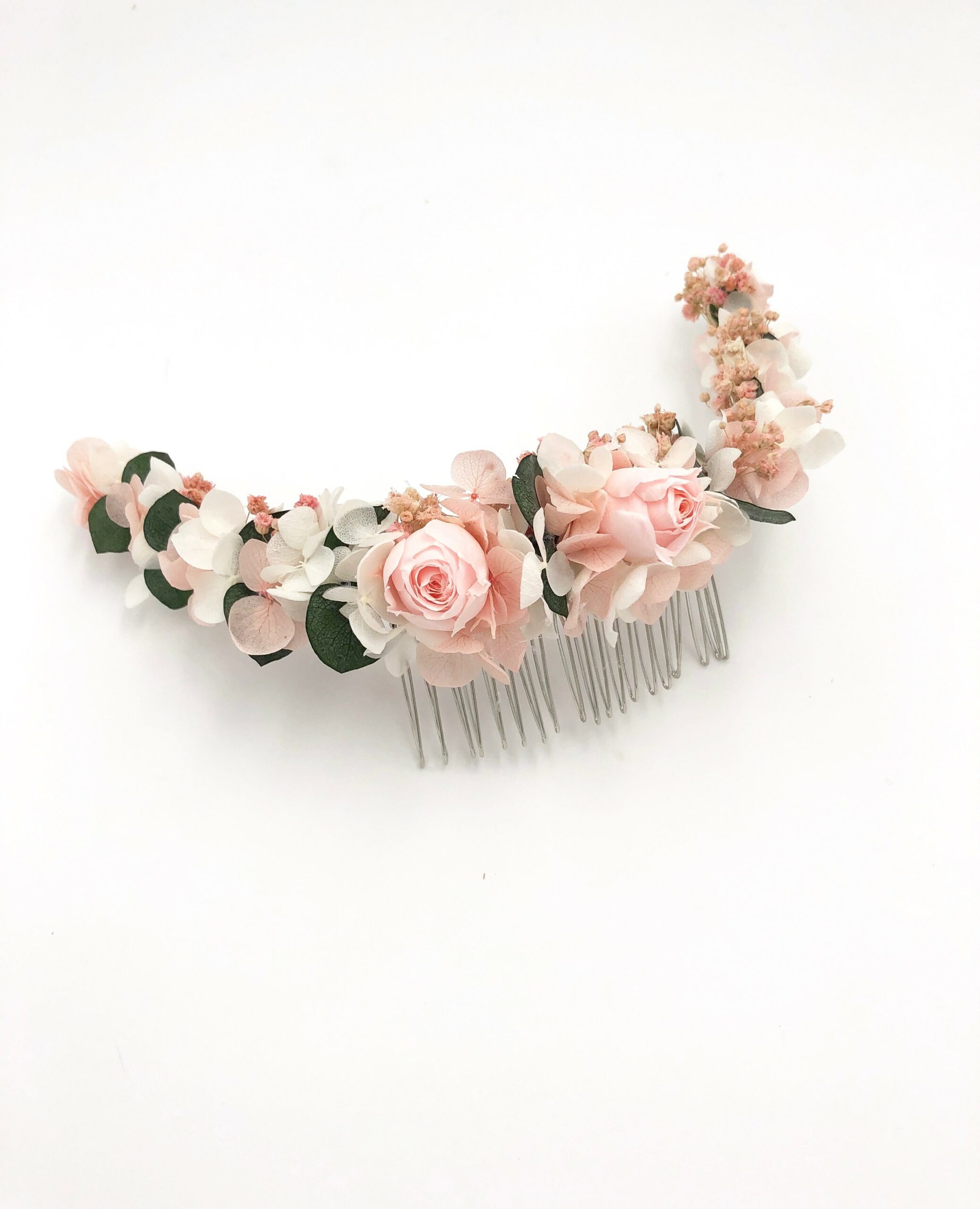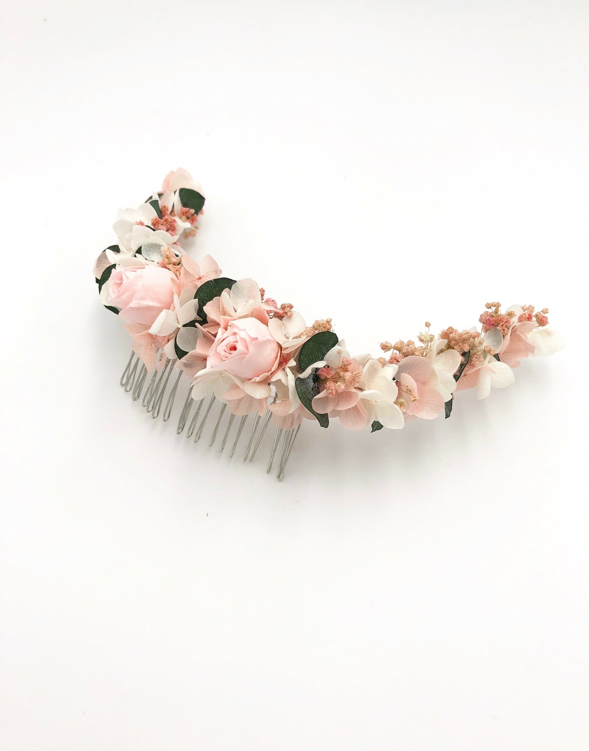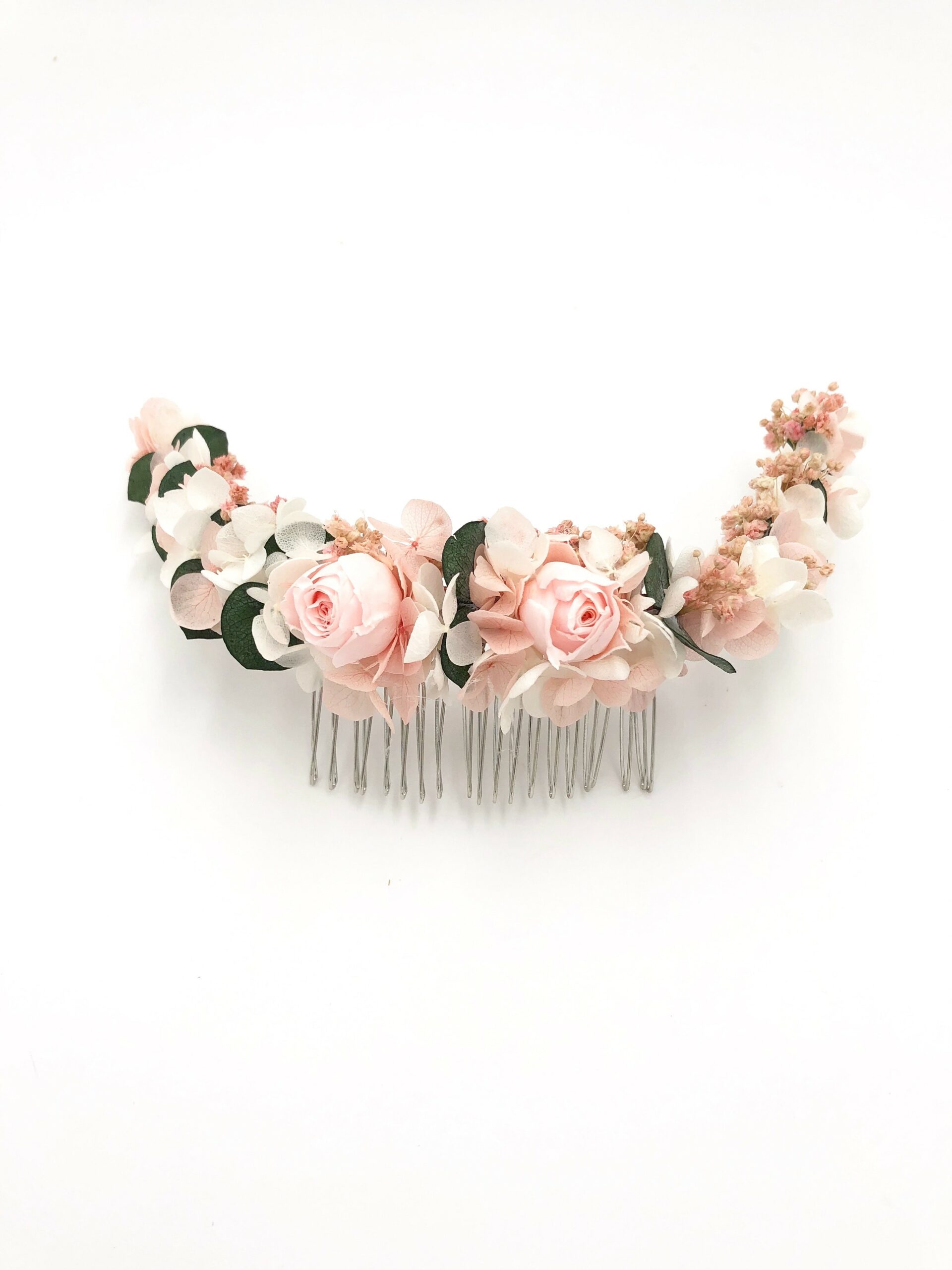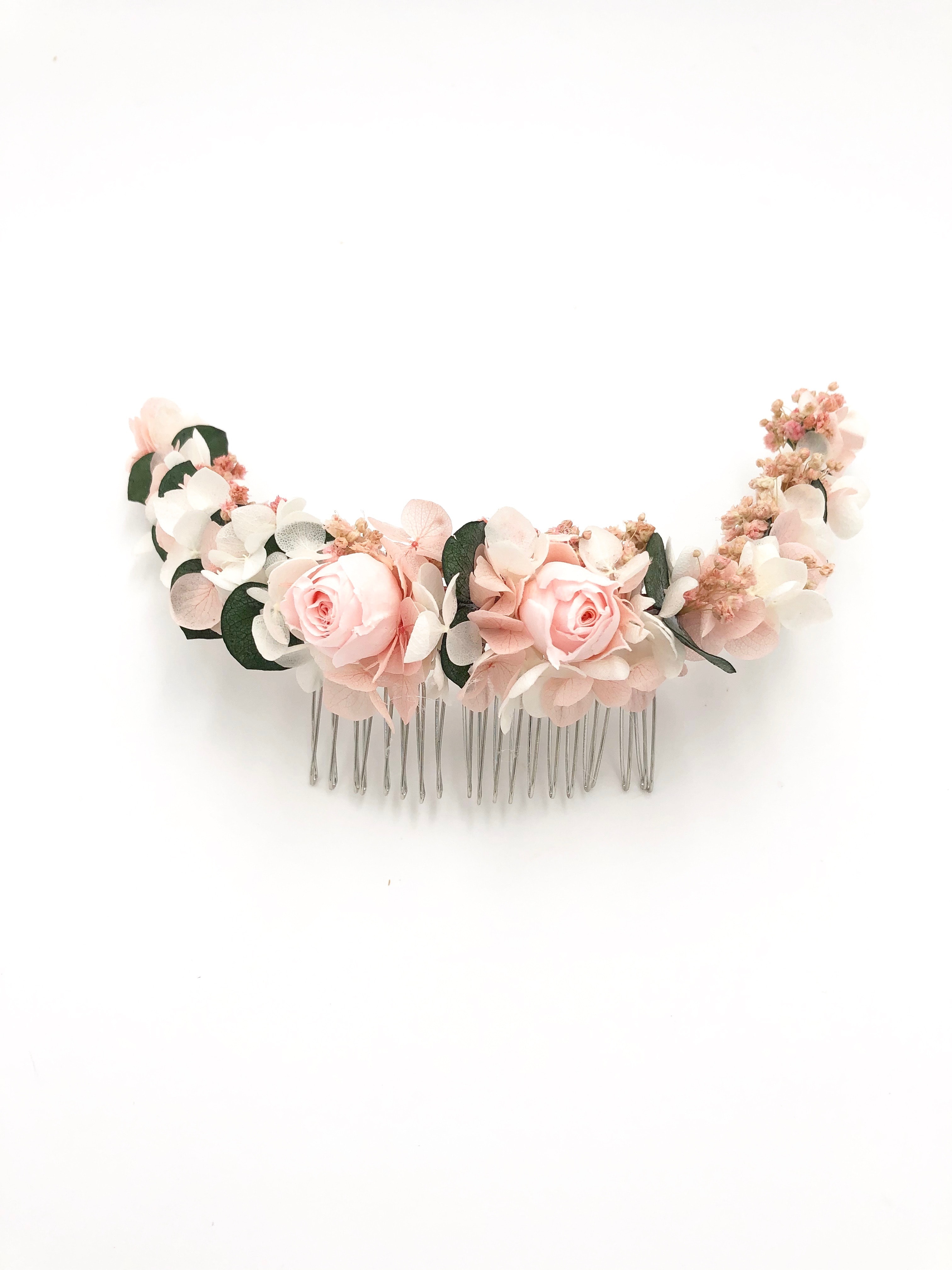 Le peigne en fleurs stabilisées Confetti en version longue fait partie de la collection romantique, qui se distingue par ses tons doux et sucrés rose pastel et dragée, qui comprend également la gamme Candi. Romantique et élégant, le peigne long Confetti est un mélange délicat de plusieurs fleurs stabilisées, et se conservera durant plusieurs années. Il associe ainsi des hortensias stabilisées roses, des brins de gypsophile stabilisé rose poudré, de petites feuilles d’eucalyptus au côté vert acidulé, et de délicats boutons de roses stabilisées. La gamme Confetti, de la collection Romantique, offre une touche très sucrée, pastel et romantique à votre tenue.