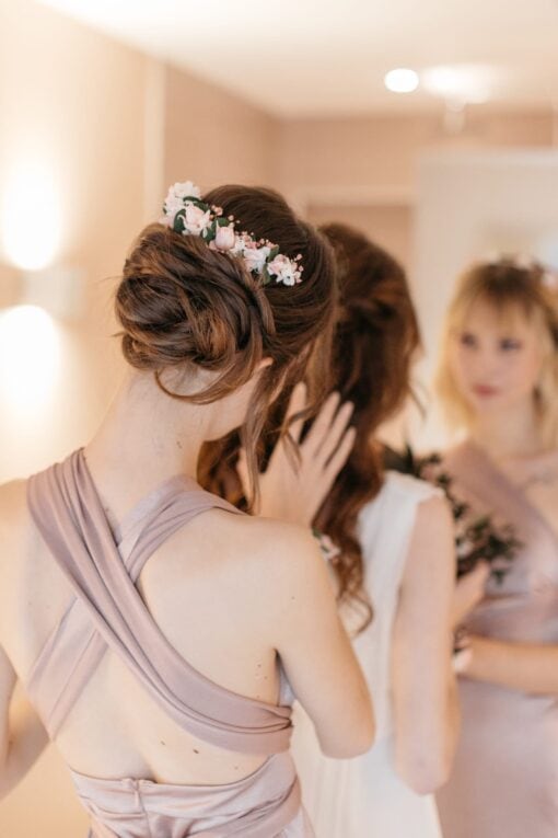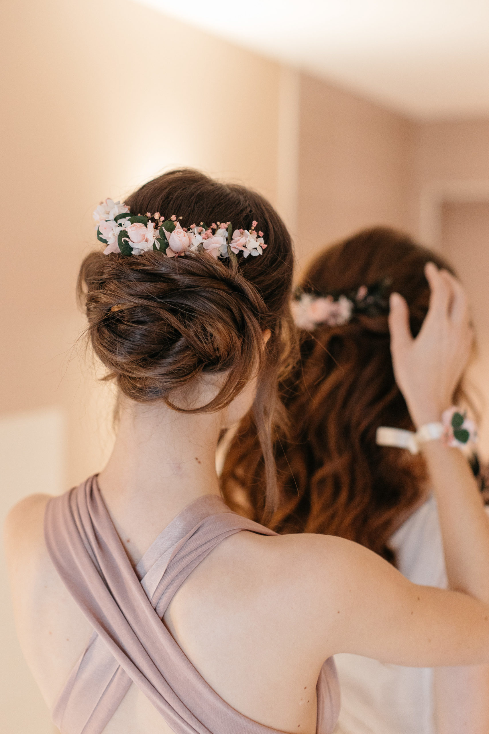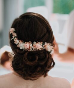 Le peigne en fleurs stabilisées Confetti dans sa version longue est idéal pour sublimer un chignon, mais également des cheveux plus détachés. C’est une option très élégante pour les mariées qui hésitent entre la couronne et le peigne. Facile d’attache, il peut se combiner avec différents accessoires de cheveux pour les demoiselles d’honneur, comme la barrette Confetti, mais aussi des bracelets simples et élégants.