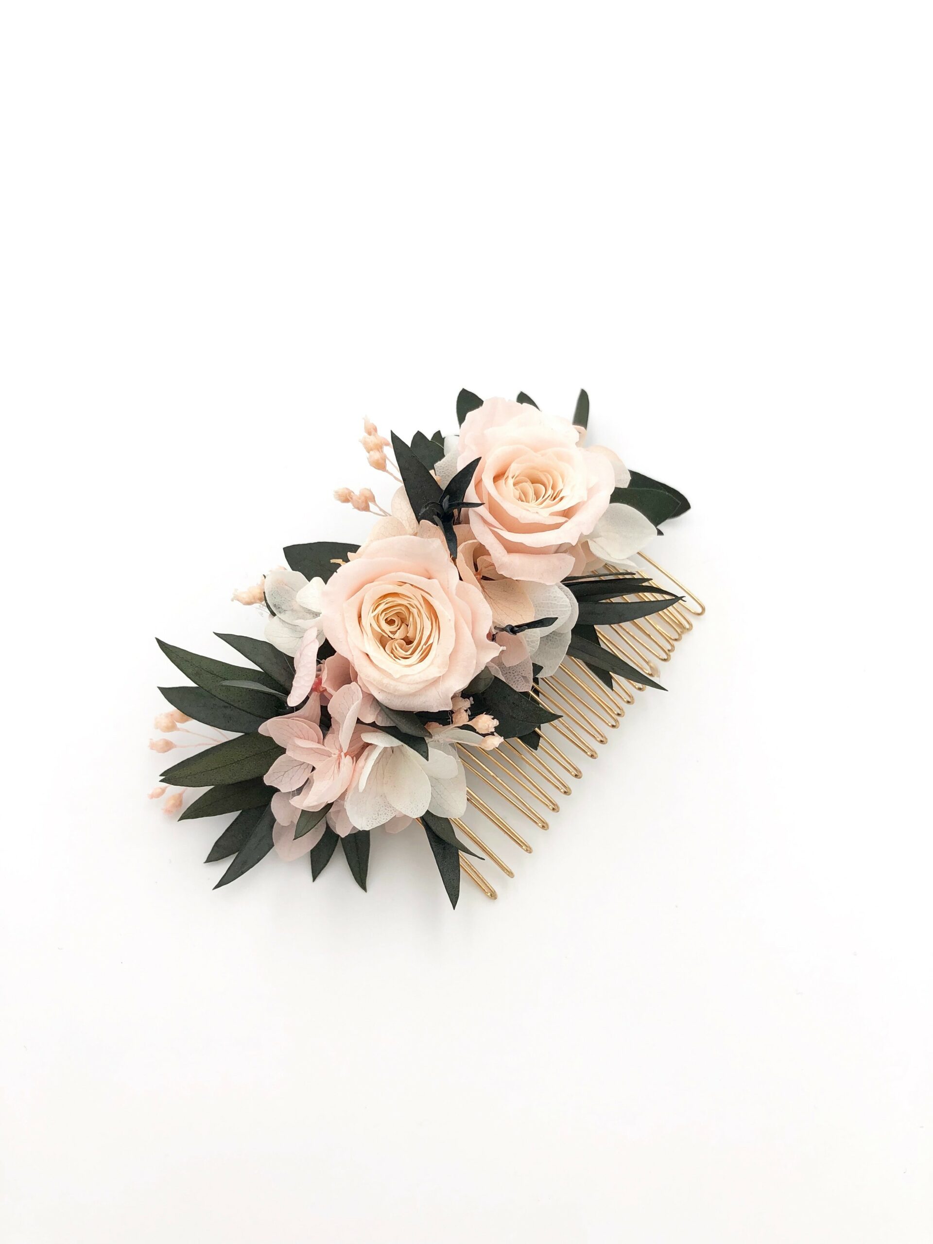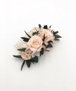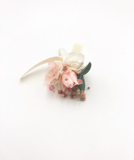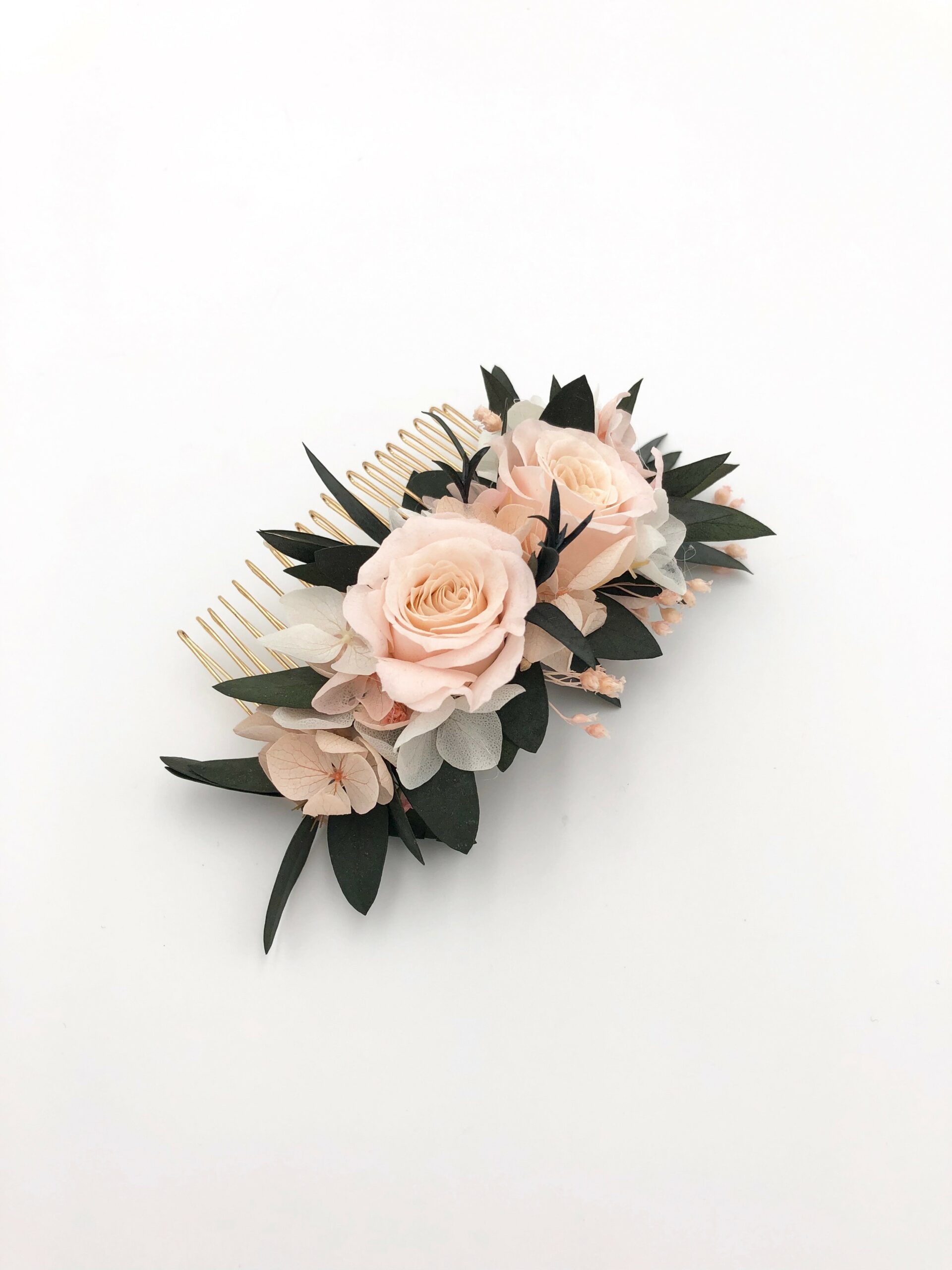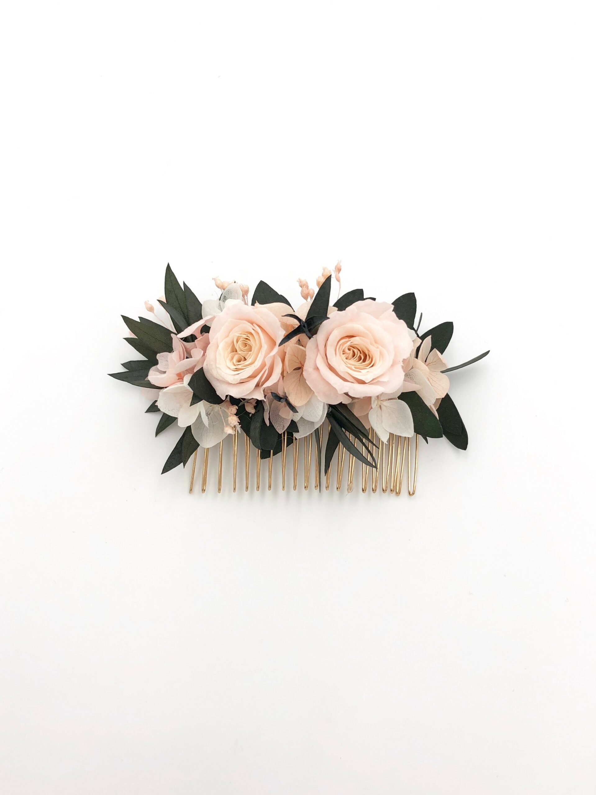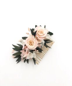 Le peigne de fleurs Lima fait partie de la collection romantique, et il se distingue par son contraste entre les tons rose pastel et le végétal de l’eucalyptus. Romantique et chic, le peigne de fleurs Lima est un mélange délicat de plusieurs fleurs stabilisées, et se conservera durant plusieurs années. Il associe ainsi deux petites roses stabilisées, des pétales d’hortensia, de l’eucalyptus et du broom. La gamme Lima, de la collection Romantique, offre une touche très pastel et romantique à votre tenue.